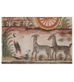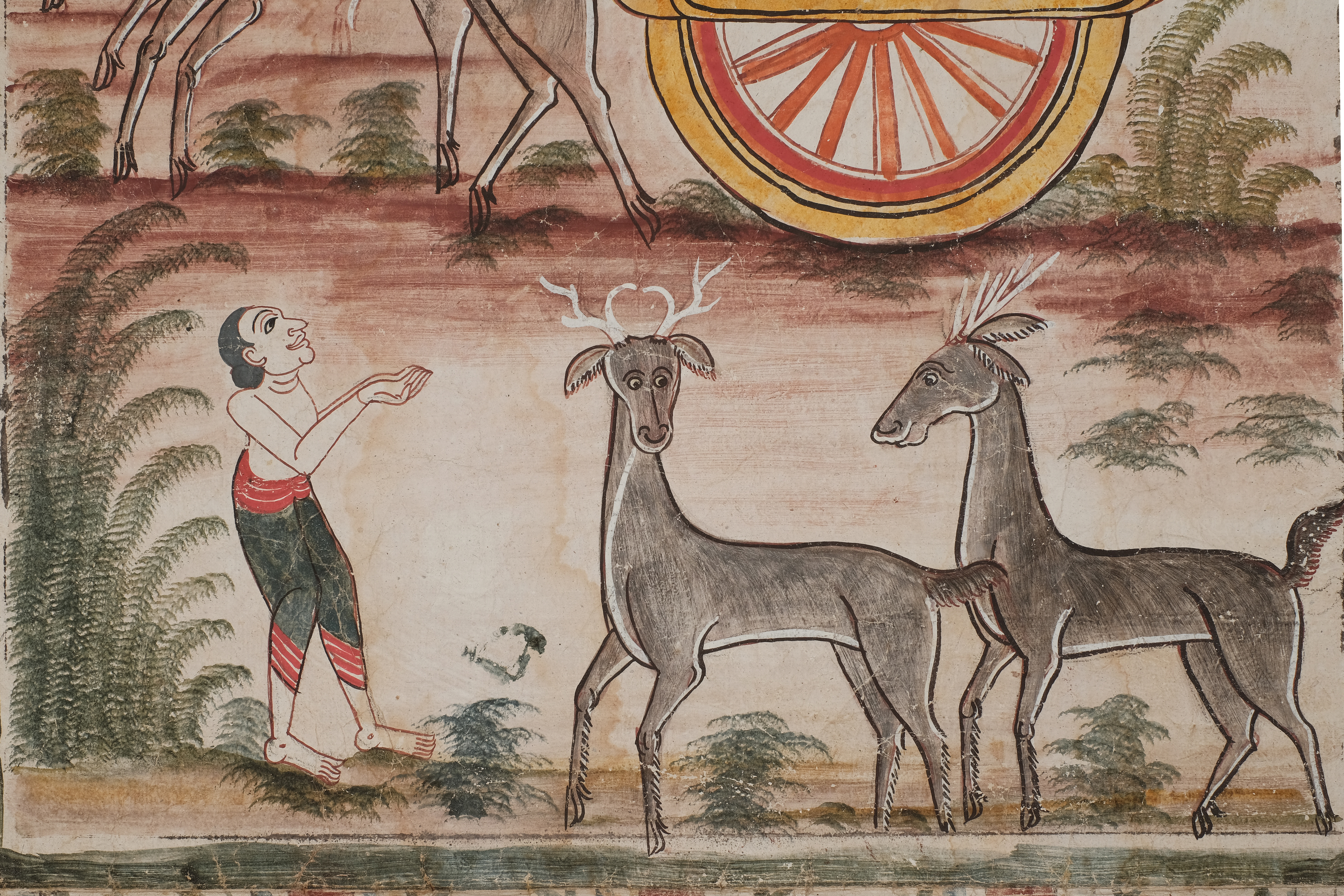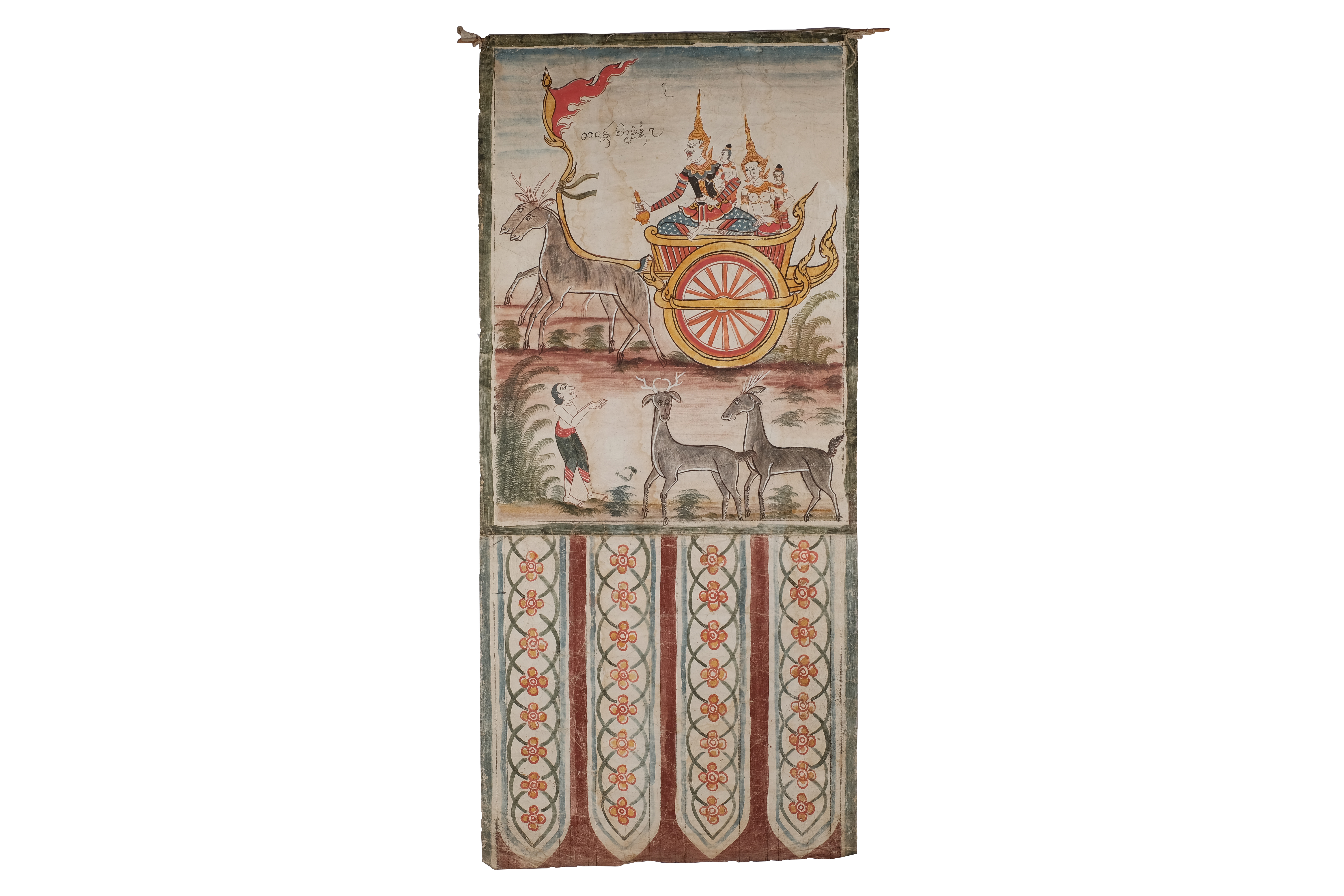 เป็นภาพสี่กษัตริย์ที่มีการแต่งองค์ทรงเครื่องอย่างกษัตริย์แบบจิตรกรรมไทยภาคกลางแต่พระนางมัทรีและพระกัณหายังคงรูปแบบการนุ่งซิ่นต๋าตีนแดงแบบพื้นเมืองอยู่ เป็นการผสมผสานศิลปะแบบไทยภาคกลางและแบบพื้นเมืองอย่างลงตัว กษัตริย์ทั้งสี่ประทับอยู่บนราชรถที่มีลักษณะคล้ายเกวียนแต่ลักษณะแบบจิตรกรรมไทยภาคกลาง มีกวางเป็นพาหนะทั้ง 2 ตัวที่ช่างให้สีสันที่มีความคล้ายคลึงกับธรรมชาติ และช่างก็ใช้เทคนิคการกระทุ้งสีให้มีลักษณะคล้ายพุ่มใบเฟิร์น และการแต่งการของพราหมณ์มีลักษณะเปลือยอก มวยผมต่ำ นุ่งโจงกระเบนเขียวขอบแดงแบบไทยภาคกลาง เทคนิคสีที่ใช้เป็นสีฝุ่นมี 11 สีคือ สีแดง ส้ม เหลือง ขาว เขียวเข้ม เขียวอ่อน น้ำตาลแดง ดำ ฟ้า เทา ขนาดความกว้าง 66 เซนติเมตร ยาว 147เซนติเมตร เชิงพระบฏปรากฏลายพรรณพฤกษา 4ช่อง สีที่ใช้คือเขียวแก่ ฟ้า เหลือง แดง น้ำตาลแดง