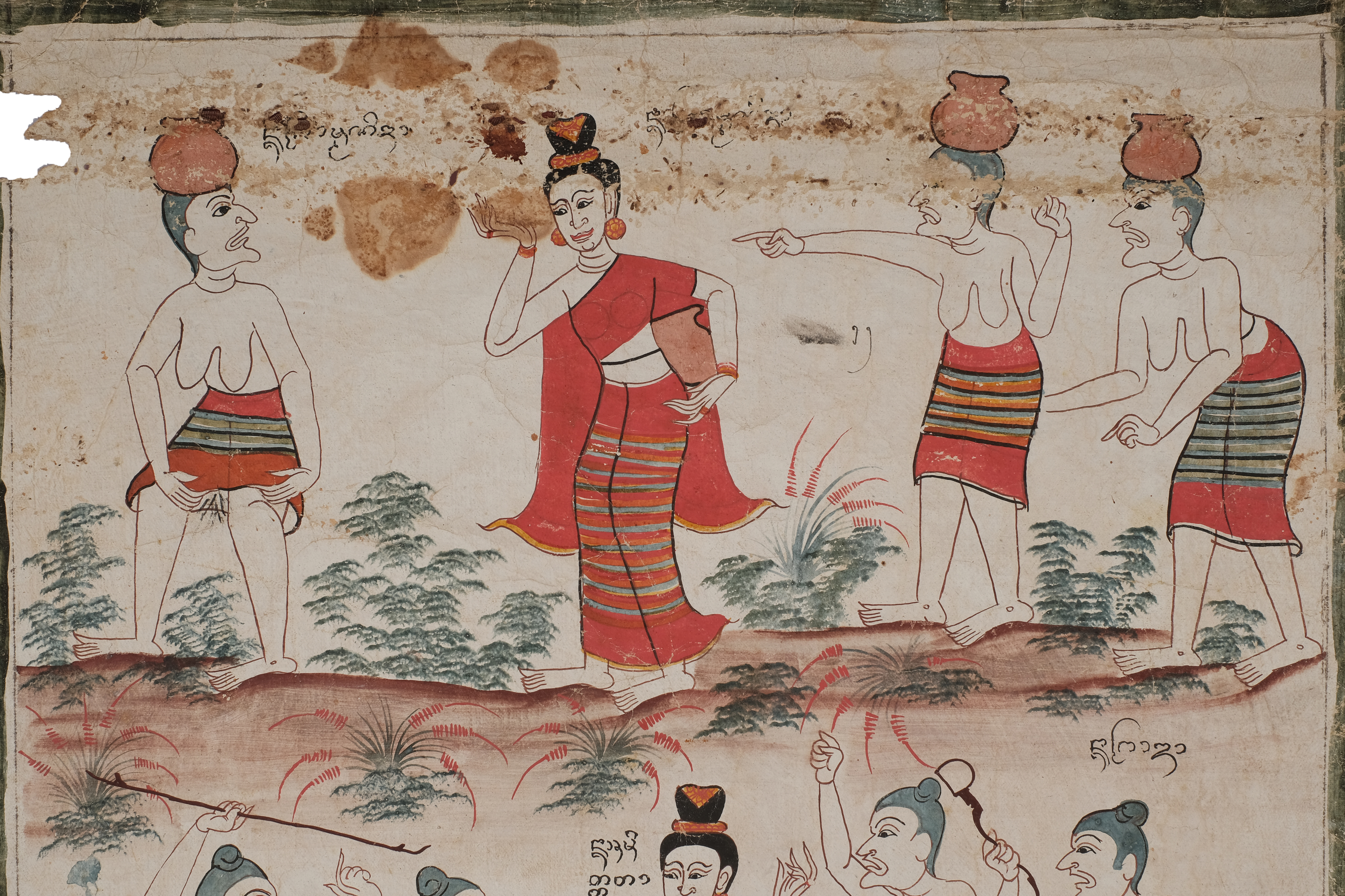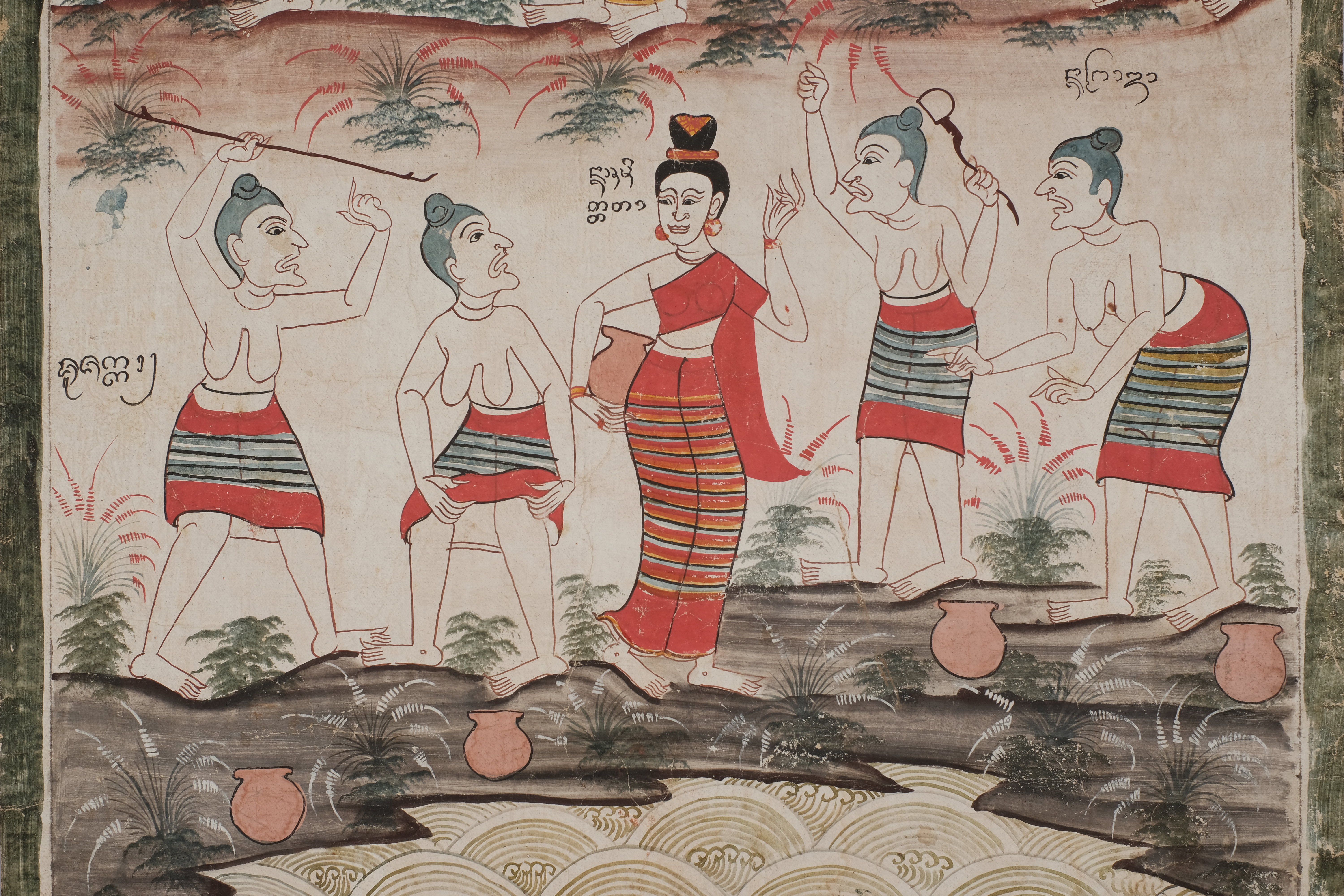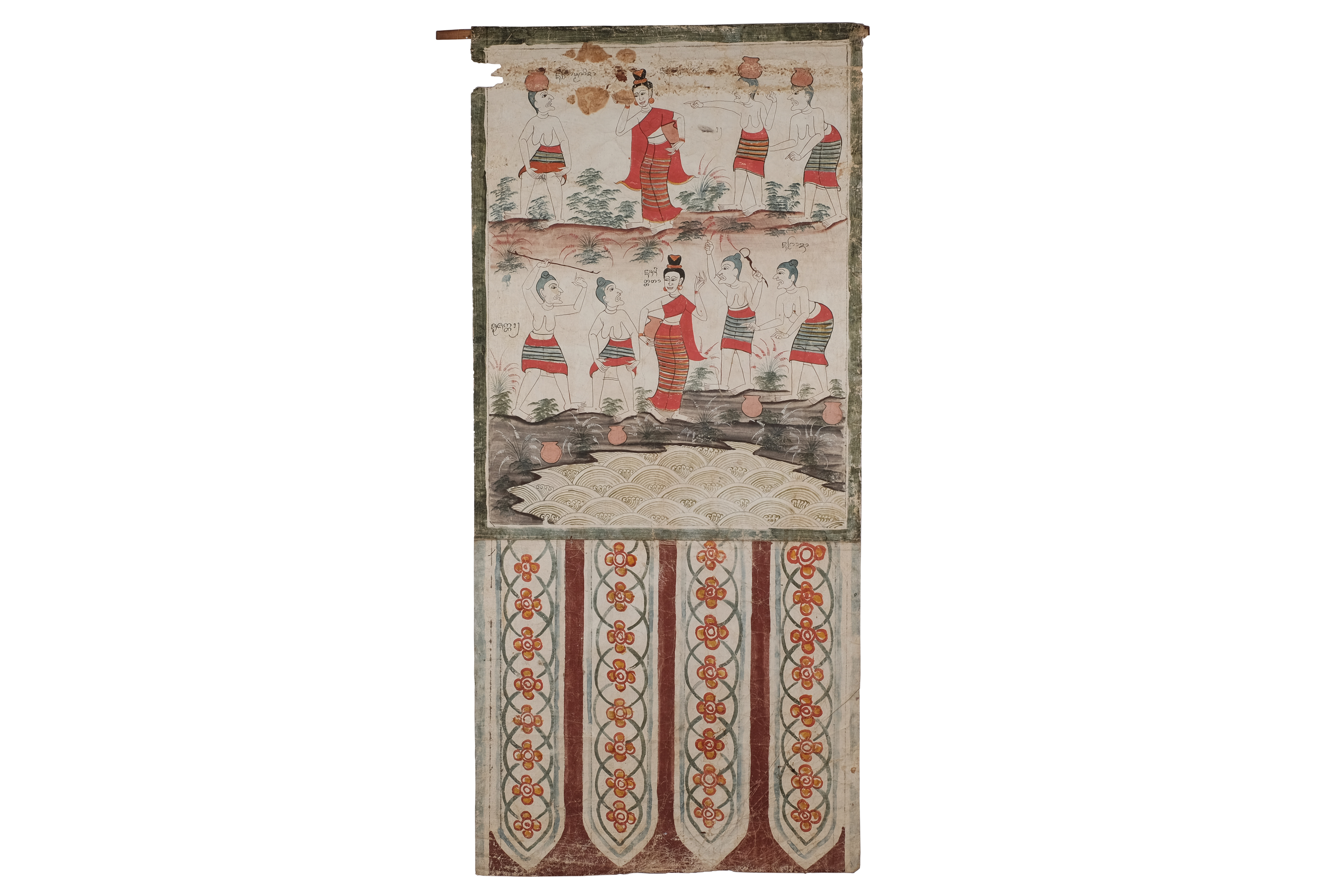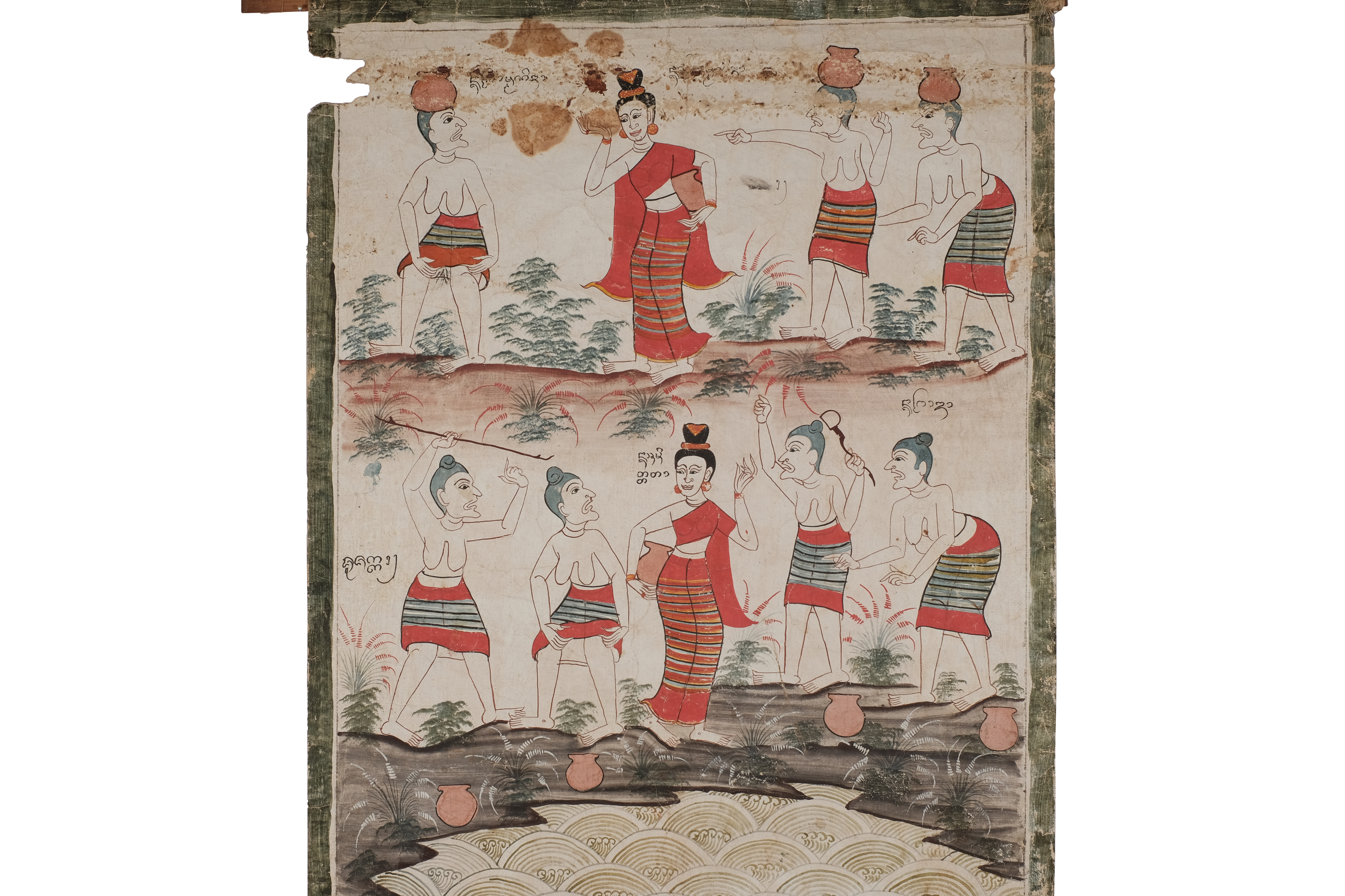 นางอมิตดาไปตักน้ำที่ท่าแล้วถูกกลุ่มแม่บ้านรังแก เหตุเพราะอิจฉาที่นางอมิตดาปรนนิบัติเฒ่าชูกชกเป็นอย่างดี ทำให้นางอับอายไม่ยอมทำการทำงานบ้าน ภาพนี้มีการแบ่งเป็น 2 ตอนคือ ภาพบนคือนางอมิตดาถูกแม่บ้านรุมด่านาง จะสังเกตจากท่าทางที่แสดงออกมาพร้อมสีหน้า อีกทั้งมีการเปิดผ้าซิ่นให้เห็นอวัยวะเพศเพื่อแสดงให้ผู้ชมรับรู้ว่า แม่บ้านมีอารมณ์ที่โกรธอย่างรุนแรงเลยต้องแสดงกริยาแบบนั้นออกมาและที่น่าสนใจอีกอย่างคือการนำหม้อตาลมาเทินไว้ตรงหัว ซึ่งวัฒนธรรมเหล่านี้ปรากฏอยู่ในวิถีชีวิตของชาวล้านนาในอดีต ภาพล่างคือภาพแม่บ้านรุมด่านางอมิตดาเหมือนกันแต่แม่บ้านมีการนำกิ่งไม้ กระบวยน้ำไล่ตีนางอมิตดาเพราะความอิจฉานาง ลักษณะการแต่งกายของแม่บ้านคือการเปลือยอก มวยผมสูง นุ่งซิ่นต๋าลายริ้วสลับสีต่อตีนแดง และหัวซิ่นก็ต่อด้วยสีขาวและแดงส่วนนางอมิตดาก็ยังคงแต่งกายเหมือนกับภาพที่ 24 นอกจากนนี้ช่างเขียนยังมีการเขียนลายน้ำลักษณะซ้อนชั้นกันแบบจิตรกรรมไทยภาคกลางอย่างชัดเจนและปรากฏเทคนิคการกระทุ้งสีเป็นพุ่มไม้ที่มีดอกไม้ป่าสีแดงแทรกอยู่เป็นที่ เทคนิคการใช้สีคือการใช้สีฝุ่น มีทั้งหมด 10 สีคือ สีแดง ส้ม ดำ เหลือง ฟ้า เทา น้ำตาลแดง เขียวเข้ม เขียวอ่อน เปลือกไข่ ขาว ขนาดความกว้าง 66 เซนติเมตร ยาว 146 เซนติเมตร เชิงภาพพระบฏปรากฏลายพรรณพฤกษา 4 ช่อง สีที่ใช้คือ สีแดง เหลือง ฟ้า เขียวแก่ น้ำตาล