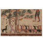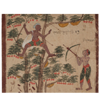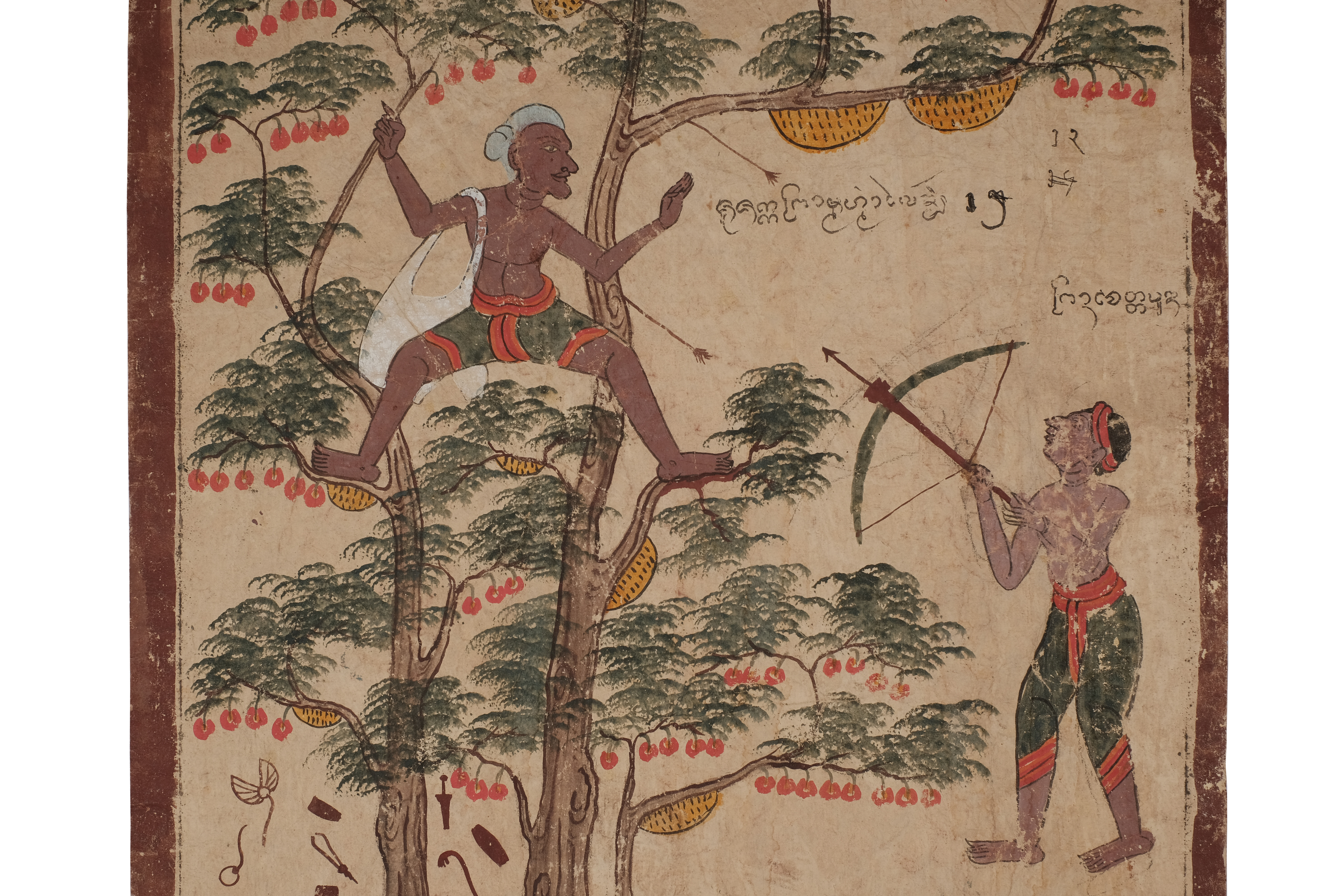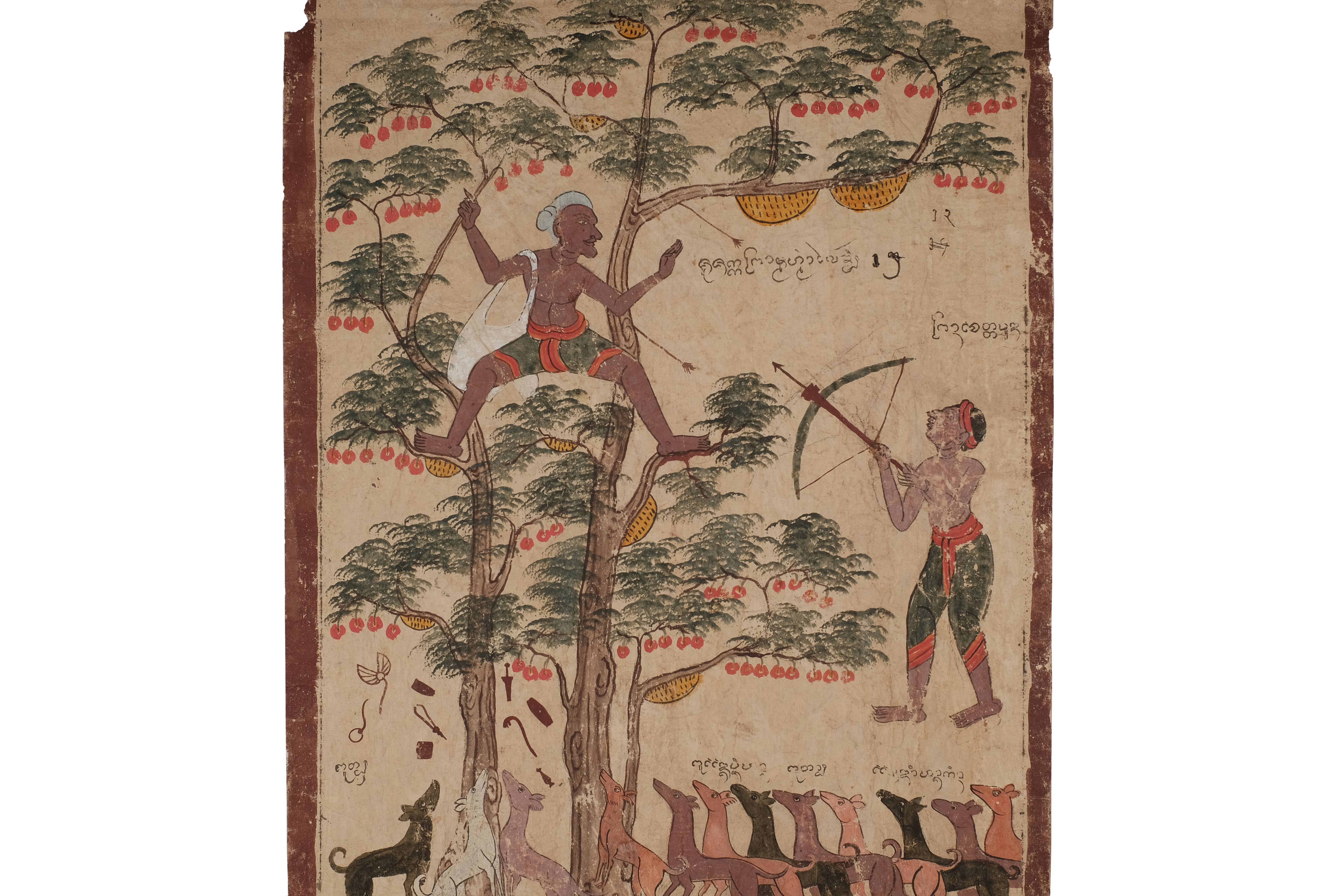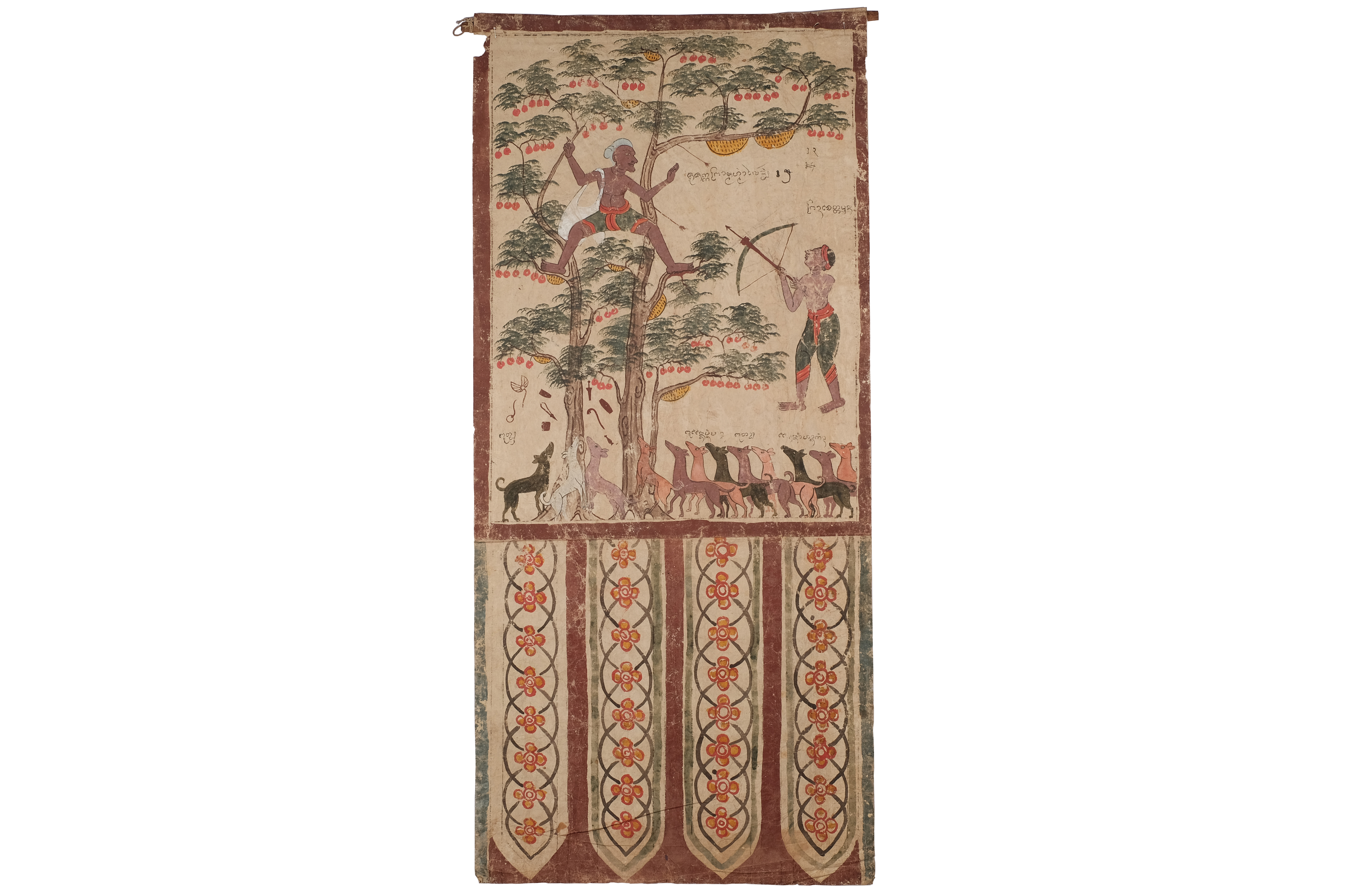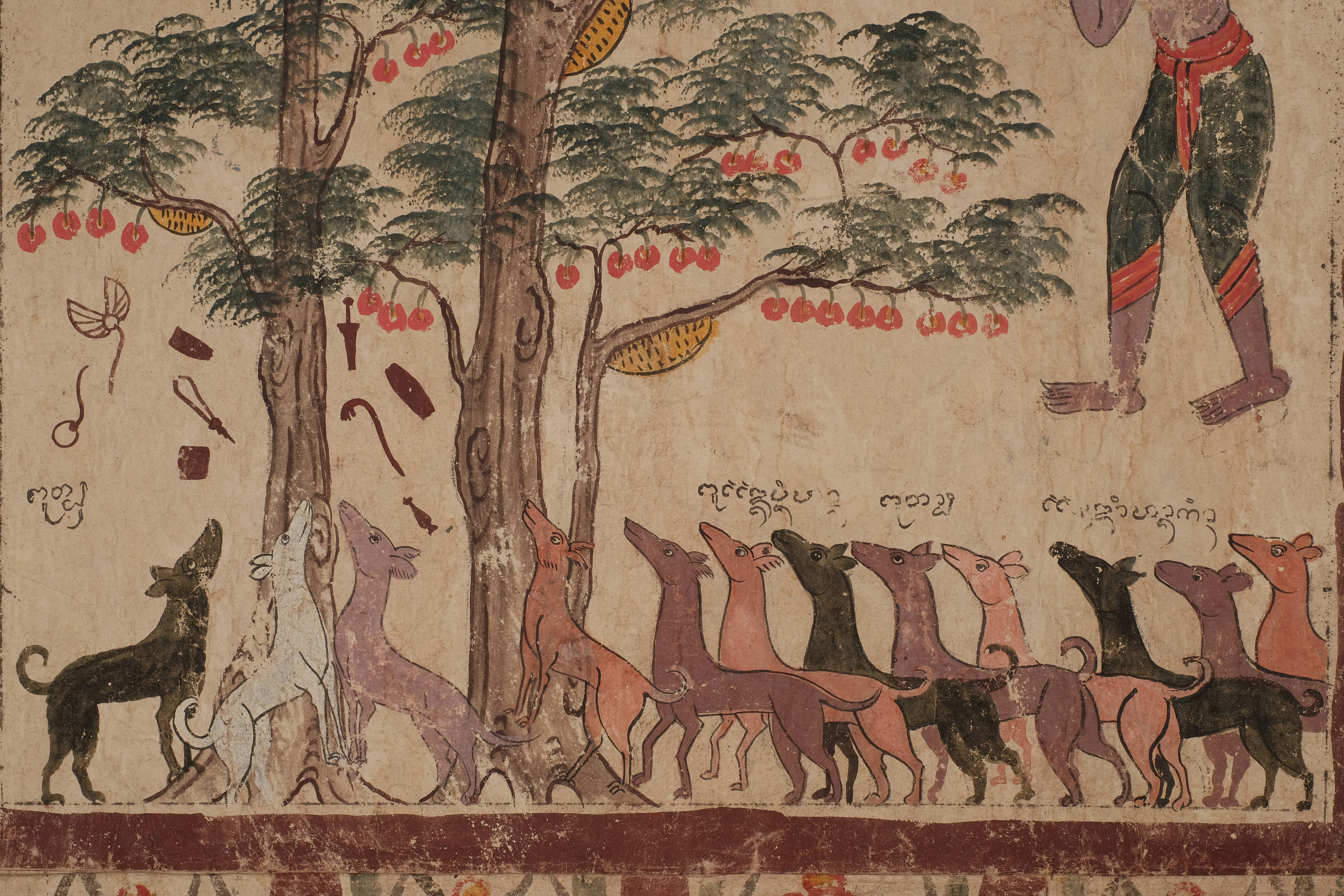 พรานเจตบุตรมีหน้าที่เฝ้าทางเข้าป่าเพื่อมิให้ผู้ใดเข้าไปรบกวนการจำศีลของสี่กษัตริย์ แล้วเห็นพราหมณ์เฒ่าชูชกบุรุกเข้าไปเลยเข้าไปรอบทำร้ายชูชก ภาพนี้เป็นฉากที่ดูแล้วสนุกสนานที่มีชายแก่ปีนต้นไม้หนีสุนัข 12 ตัวของพรานเจตบุตรจนข้าวของเครื่องใช้ต่างๆในถุงย่ามชูชกเช่น พัด กระบวยน้ำ เครื่องกินหมาก ไม้เท้าตกลงมากระจัดกระจาย ลักษณะต้นไม้ที่เฒ่าชูชกปีนขึ้นไปเป็นต้นไม่ที่มีขนาดใหญ่ 2 ต้นที่ปรากฏการใช้เทคนิคการกระทุ้งสี มีรวงผึ้งและผลไม้สดสีแดงแกนในสีเหลืองที่สร้างความมีสีสันกับตัวงานได้มากเลยทีเดียว พรานเจตบุตรก็มีเครื่องมือสำคัญที่ใช้ในการออกป่าคือธนูหน้าไม้ เทคนิคสีที่ใช้คือสีฝุ่นมีทั้งหมด 9 สีคือ แดง เหลือง ขาว ม่วง เขียวเข้ม น้ำตาลแดง ดำ ฟ้า ชมพู ขนาดความกว้าง65 เซนติเมตร ยาว 144 เซนติเมตร เชิงภาพพระบฏปรากฏลวดลายพรรณพฤกษา 4 ช่อง สีที่ใช้คือ สีเหลือง แดง เขียวเข้ม เขียวอ่อน น้ำเงิน น้ำตาลแดง