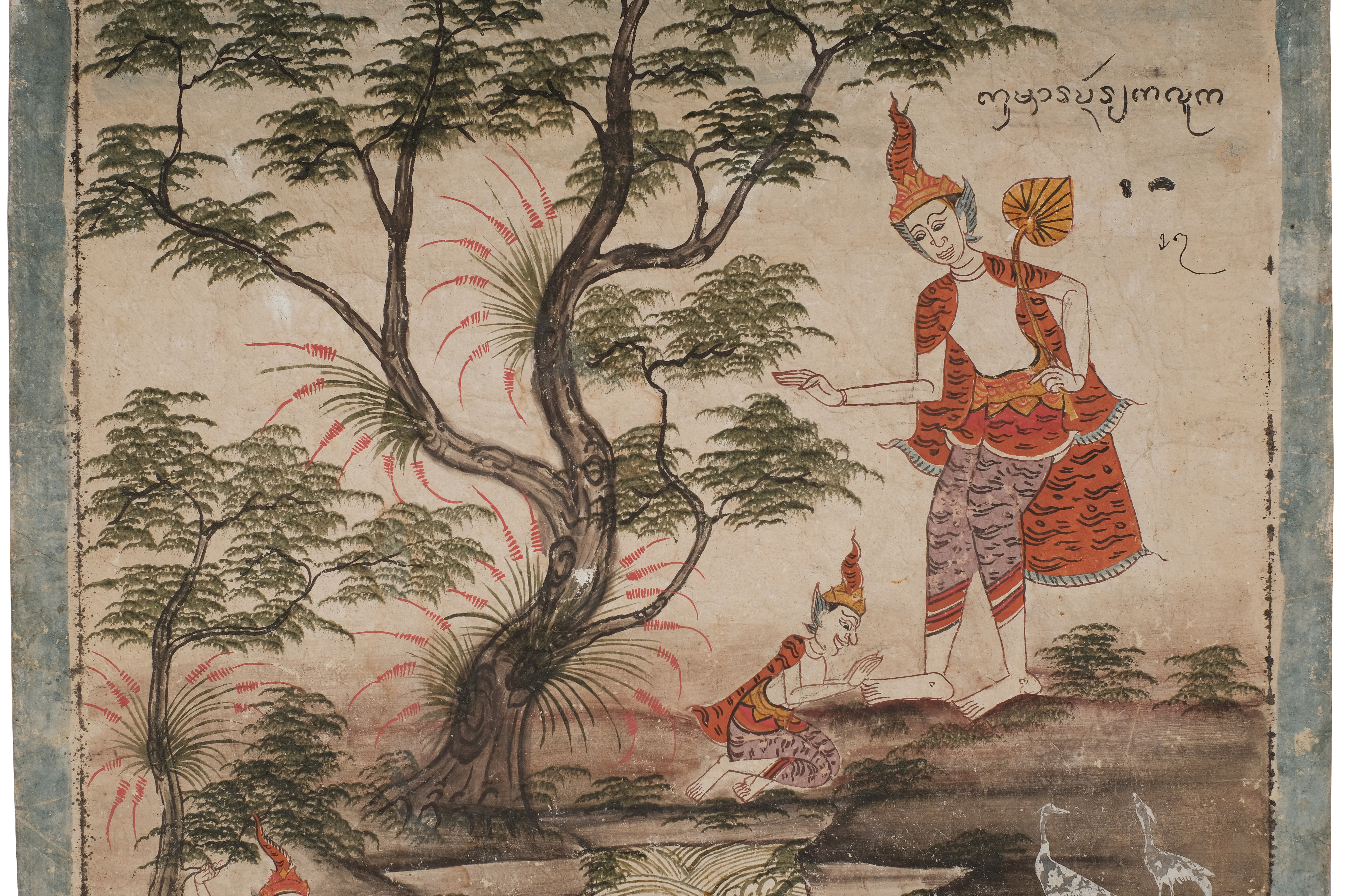 สองพระกุมารทราบว่าพระเวสสันดรจะทานตนให้เฒ่าชูชกจึงหนีไปซ่อนตัวที่สระบัว