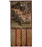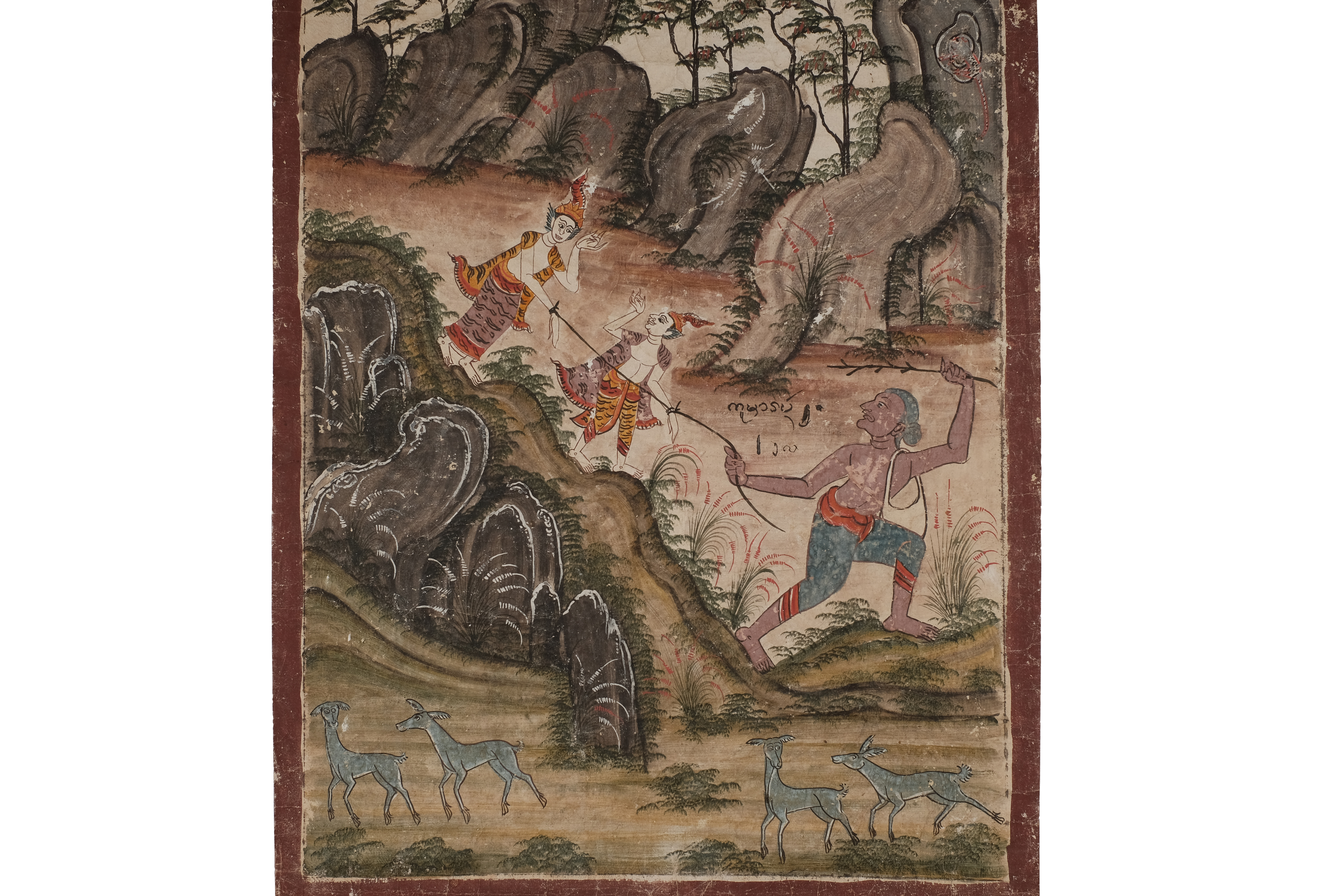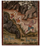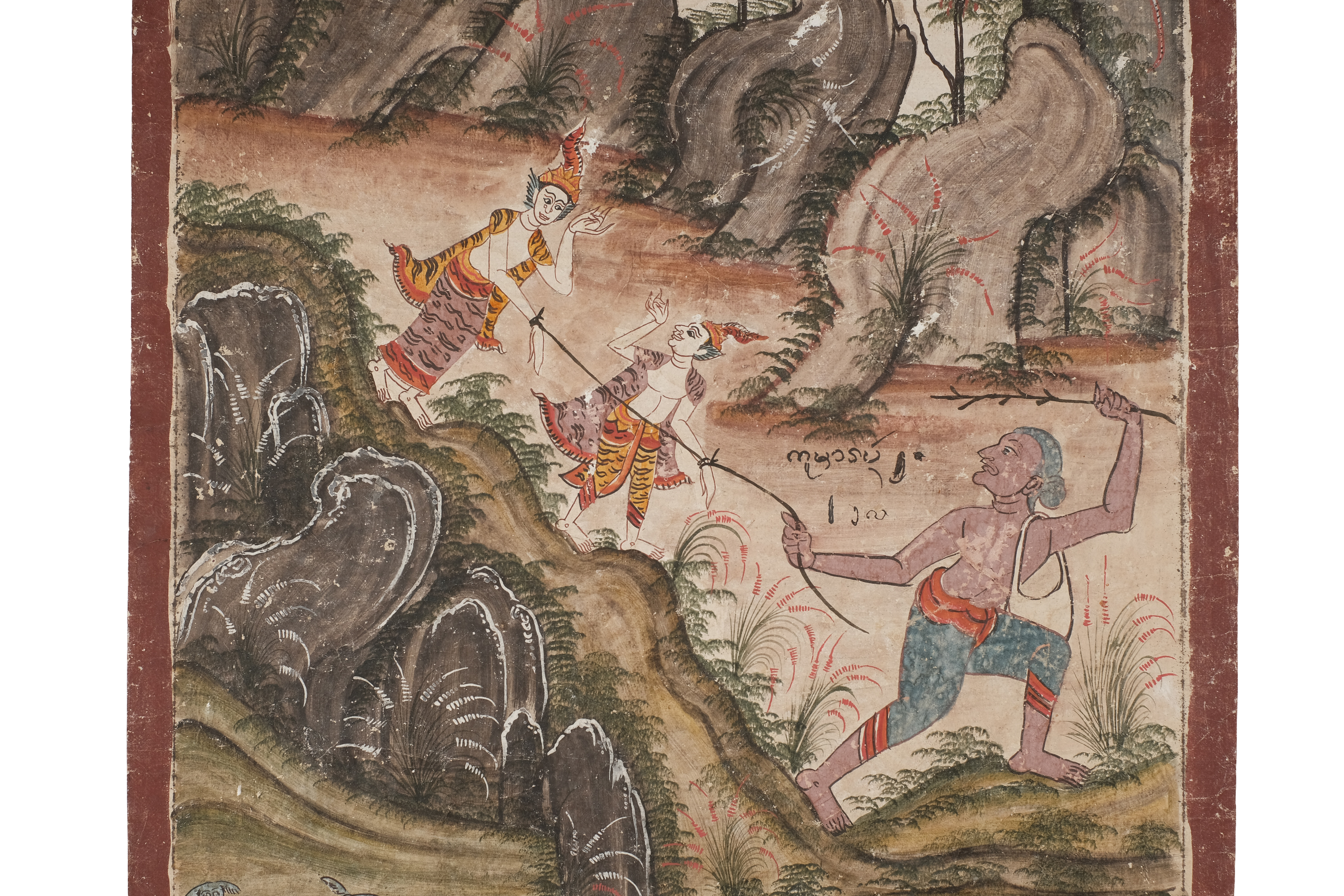 เฒ่าชูชกเอาเชือกมัดสองพระกุมาร ระหว่างทางกลับนครโกสิมพีก็มีการเฆี่ยนตีสองกระกุมารไปด้วย ทำให้ผู้ชมเกิดอารมณ์รู้สึกสงสารสองพระกุมารเป็นอย่างยิ่ง ภาพนี้จะเน้นการวาดภาพหุบเขาสูงอยู่สองฟาก ซึ่งช่างมีการใช้สีที่หลากหลายในการวาดหุบเขาให้ดูมีมิติความลึกลื้น เขาบางลูกก็มีการนำสีขาวมาตัดเส้นเพื่อความชัดเจนและความโดดเด่นของหุบเขาซึ่งนับว่าช่างเขียนภาพมีความเข้าใจและมีลูกเล่นในการเขียนภาพพอสมควรนอกจากนี้ยังปรากฏการใช้เทคนิคกระทุ้งสีเป็นรูปต้นไม้และพุ่มไม้ปกคลุมอยู่อย่างหนาแน่น มีฝูงกวาง 4 ตัวกำลังหยอกล้อกันอยู่ด้านล่างของภาพ เทคนิคสีที่ใช้คือสีฝุ่น สีที่ใช้มีทั้งหมด 13 สีคือ สีแดง เหลือง ส้ม ขาว เทาปนแดง ฟ้า ม่วง ดำ น้ำตาลแดง น้ำตาลเข้ม เขียวแก่ เขียวอ่อน เทา เชิงภาพพระบฏปรากฏลวดลายพรรณพฤกษา 4 ช่อง สีที่ใช้คือ น้ำตาลเข้ม น้ำตาลแดง เหลือง เขียวแก่ แดง ขนาดความกว้าง 66.5 เซนติเมตร ยาว 140 เซนติเมตร