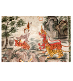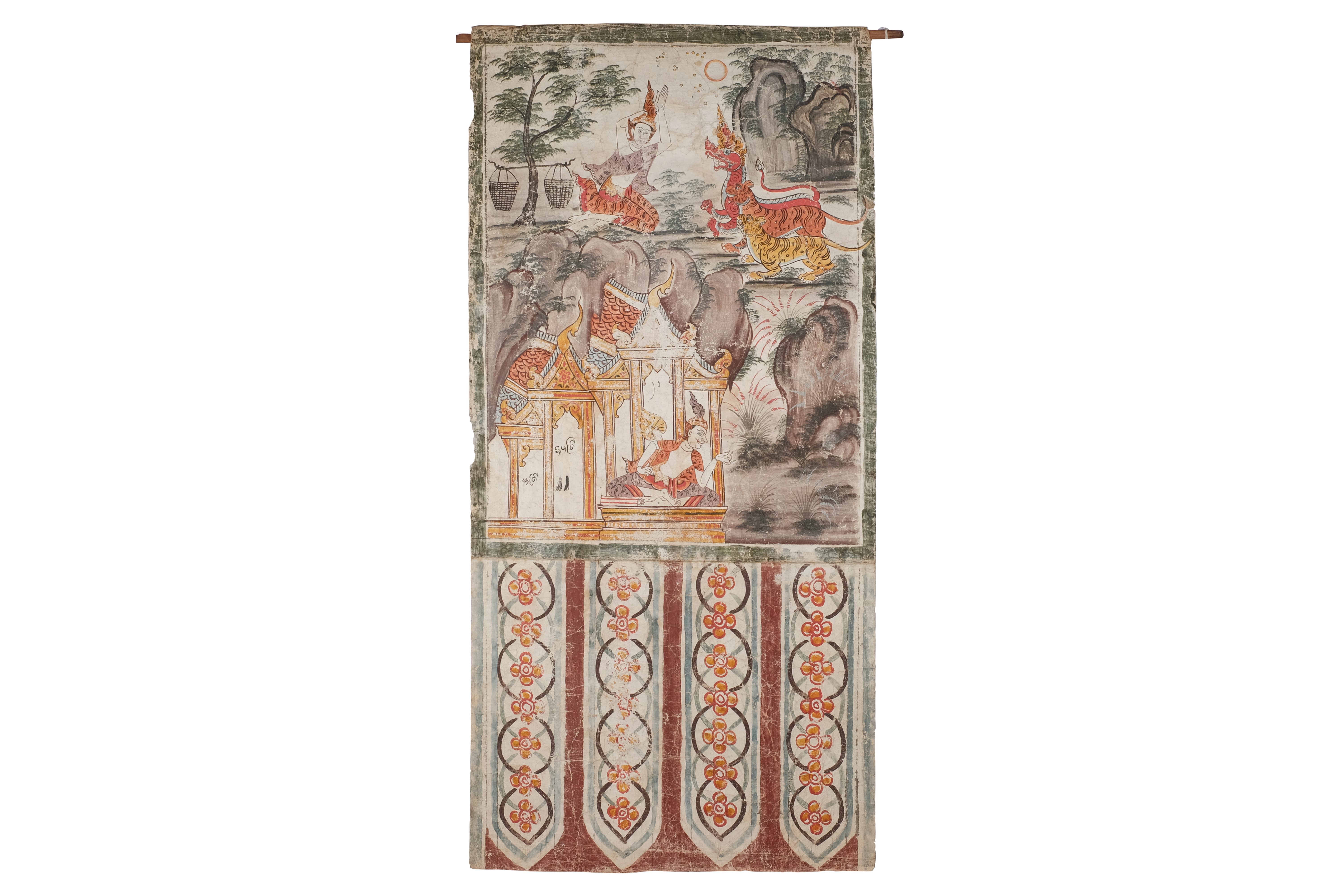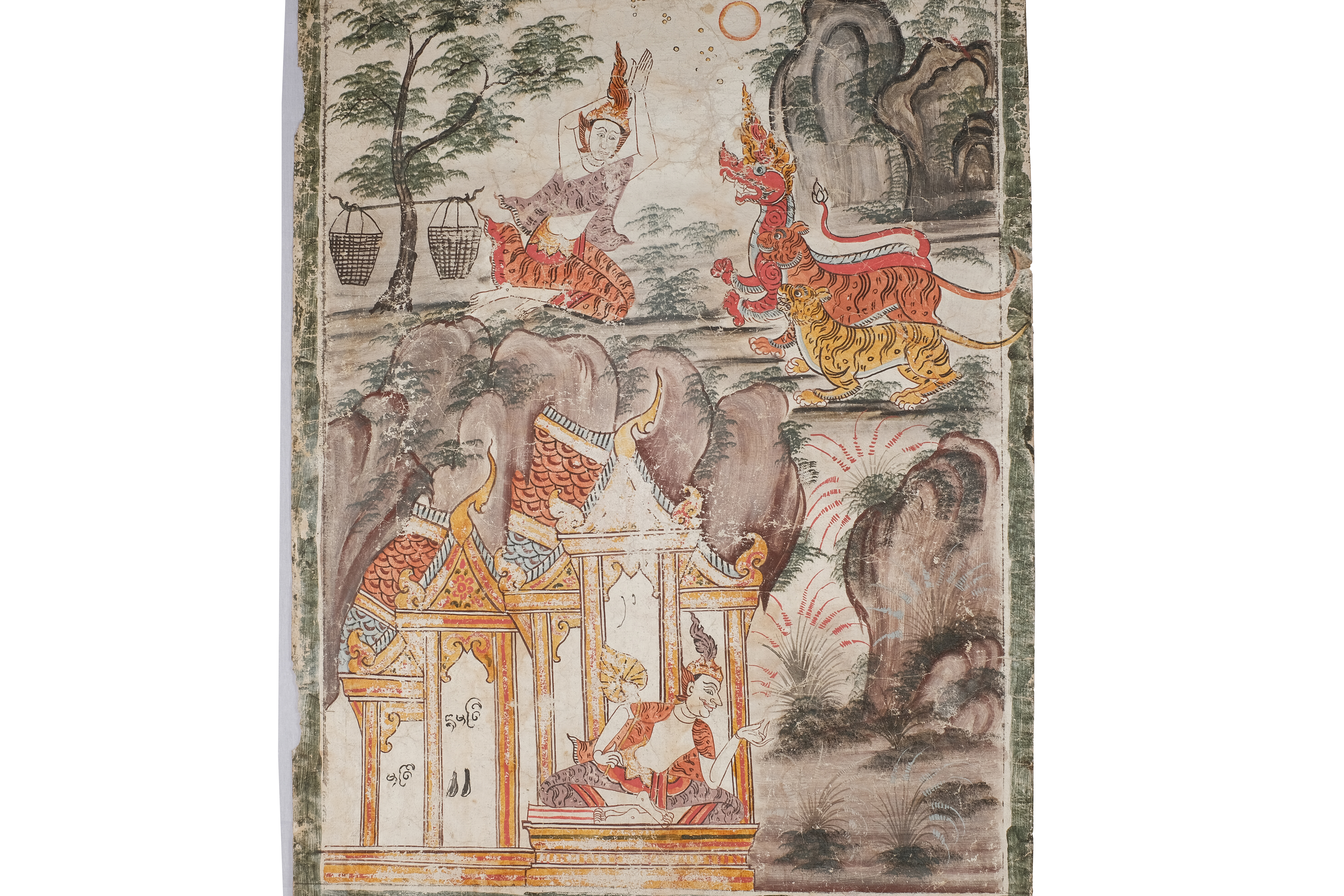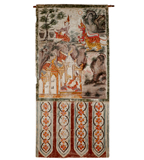 เหล่าเทวดาแปลงกายเป็นพญาสัตว์ป่าเพื่อปิดทางมิให้พระนางมัทรีกลับไปที่อาศรมเพราะกลัวพระนางมัทรีจะเจอสองพระกุมารระหว่างทาง องค์ประกอบในภาพนี้มีสิ่งที่น่าสนใจคือตัวพญาสัตว์ป่าอันมี พญาราชสีห์ พญาเสือโคร่ง พญาเสือป่า การแต่งกายของพระนางมัทรีที่มีการสวมชฏา ห่มสไบและนุ่งผ้าลายเสือ นอกจากนี้ยังมีรูปอาศรมแบบภาคกลางที่มีตัวภูเขาอยู่เบื้องหลัง อาจะมีความหมายคล้ายเส้นสินเทาในการแบ่งตัวเรื่องออกมา 2 เรื่อง ปรากฏการใช้เทคนิคการกระทุ่งสีเป็นชั้นๆเพื่อให้เกิดเป็นลายพุ่มไม้ที่มีดอกหญ้าแดง ดอกหญ้าขาวแทรกอยู่ด้วย เทคนิคสีที่ใช้คือสีฝุ่นมีทั้งหมด สีที่ใช้คือ สีแดง ส้ม เหลือง ขาว ดำ น้ำตาลเข้ม น้ำตาลอ่อน เขียวแก่ ฟ้า ม่วง ส้มเชิงพระบฏปรากฏลวดลายพรรณพฤกษา 4 ช่อง ขนาดความกว้าง 67 เซนติเมตร ยาว 140 เซนติเมตร