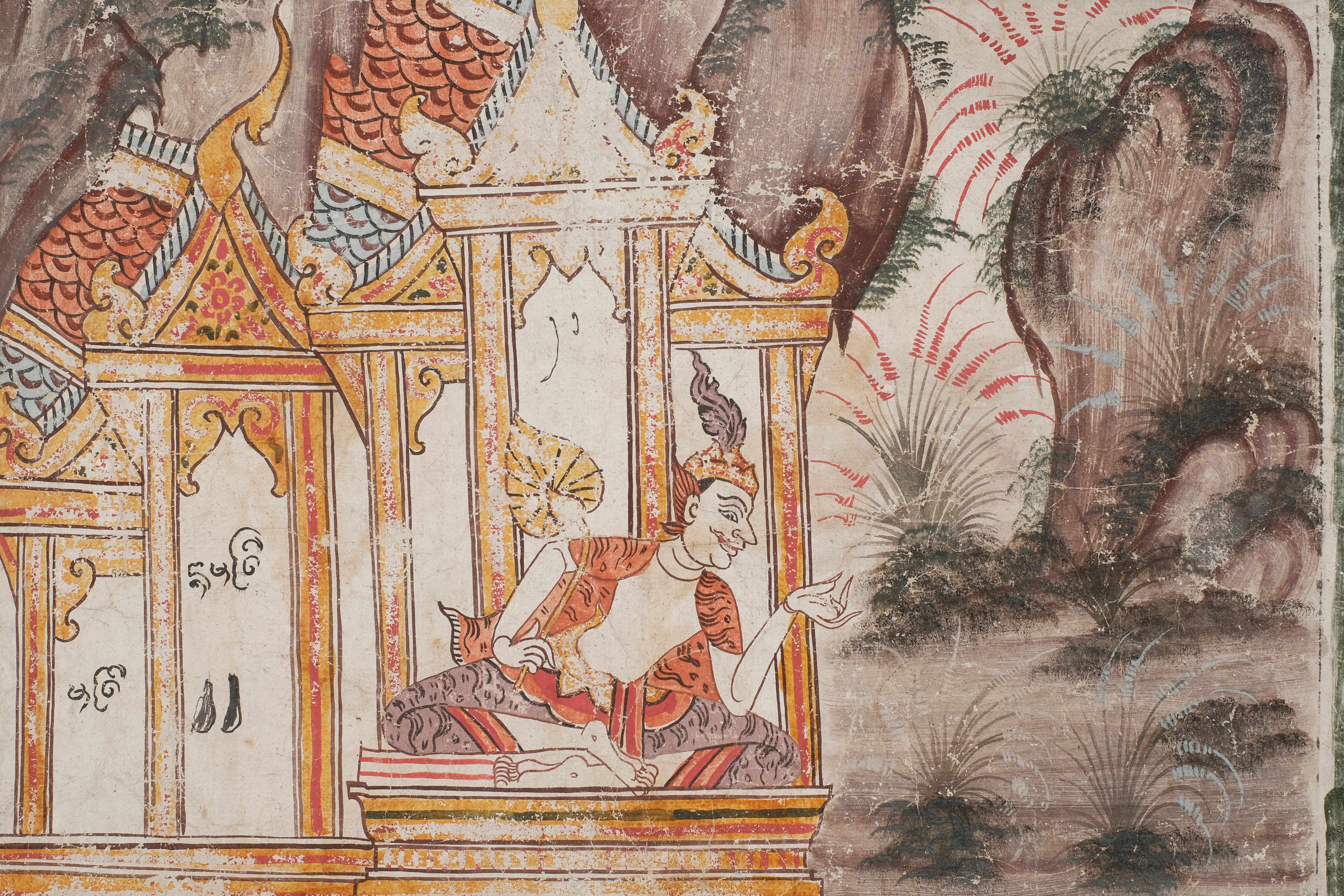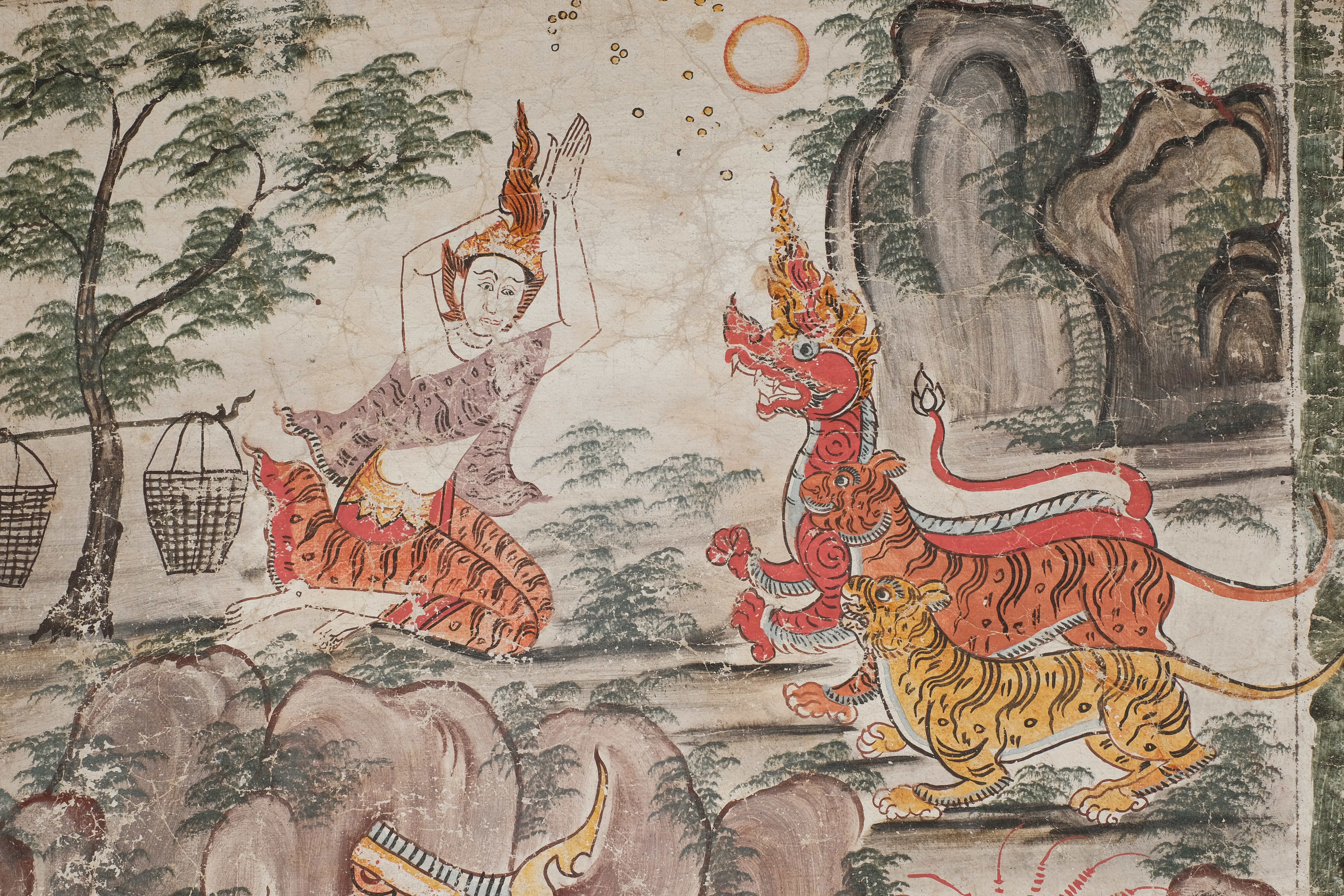 เทวดาแปลงกายเป็นพญาสัตว์ป่าขวางทางมิให้นางมัทรีไปพบสองพระกุมาร