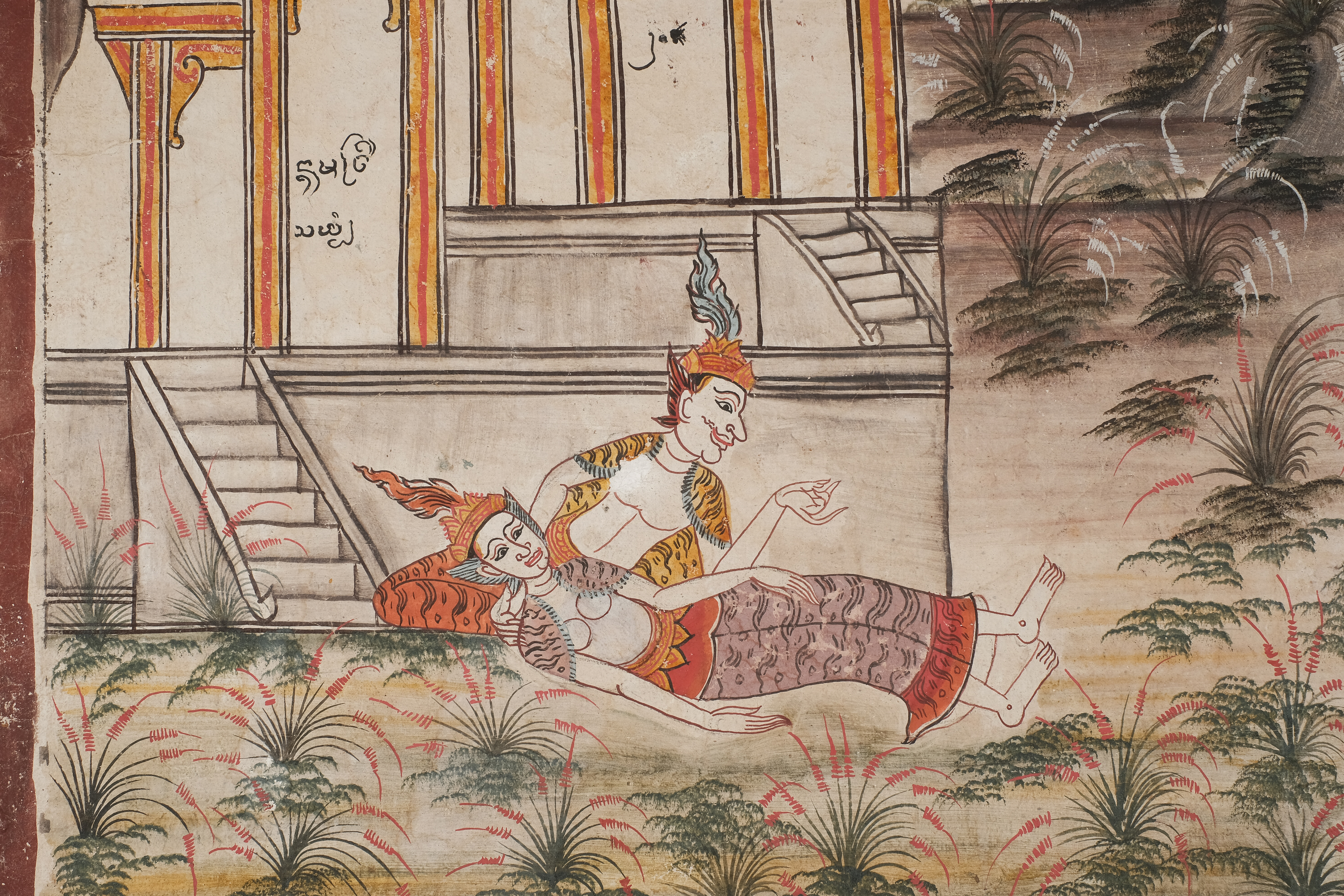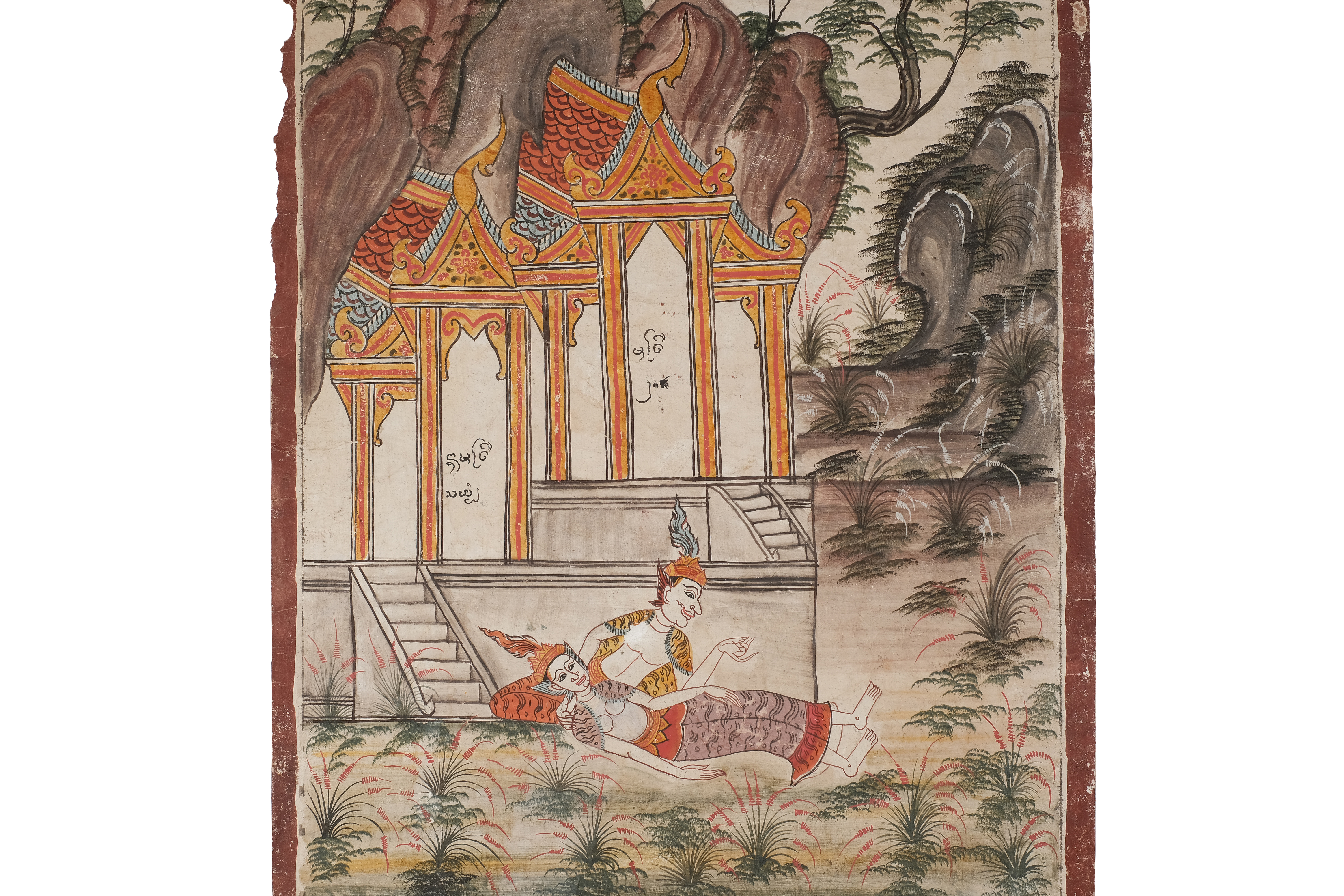 พระนางมัทรีทราบว่าพระเวสสันดรทรงประทานสองพระกุมารให้กับพราหมณ์เฒ่าชูชก พระนางทรงเสียพระทัยมากจนเป็นลมทรุดตัวลงไป การเล่าเรื่องโดภาพในเรื่องนี้ยังเป็นสถานที่พระอาศรมเหมือนเดิม ช่างเขียนมีการเขียนภาพพุ่มไม้ที่มีดอกหญ้าสีแดงและสีขาวทั่วบริเวณอาศรมเพื่อให้เห็นของความแตกต่างกับภาพที่มีความใกล้เคียงกับภาพนี้ ยังปรากฏการใช้เทคนิคกระทุ้งสีเป็นพุ่มไม้ เทคนิคสีที่ใช้คือสีฝุ่น สีที่ใช้มีทั้งหมด 10 คือ สีแดง ส้ม เหลือง ม่วง ดำ เขียวแก่ เขียวอ่อน น้ำตาลแดง น้ำตาลเข้ม ขาว เชิงภาพพระบฏปรากฏลวดลายพรรณพฤกษา 4 ช่อง สีที่ใช้คือสีฟ้า น้ำตาลเข้ม น้ำตาลแดง เหลือง เขียวแก่ แดง ขนาดความกว้าง 66.5 เซนติเมตร ยาว 136 เซนติเมตร