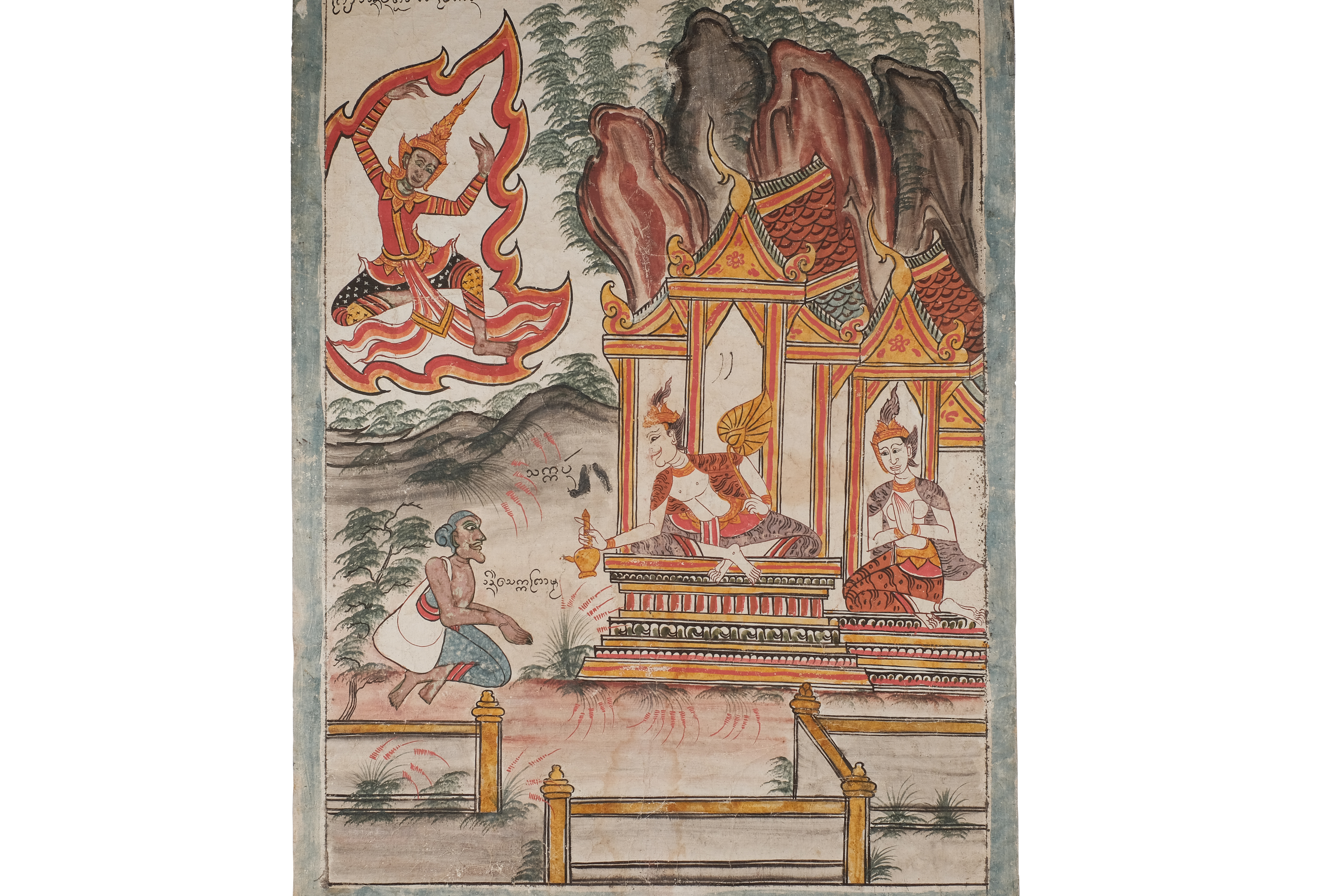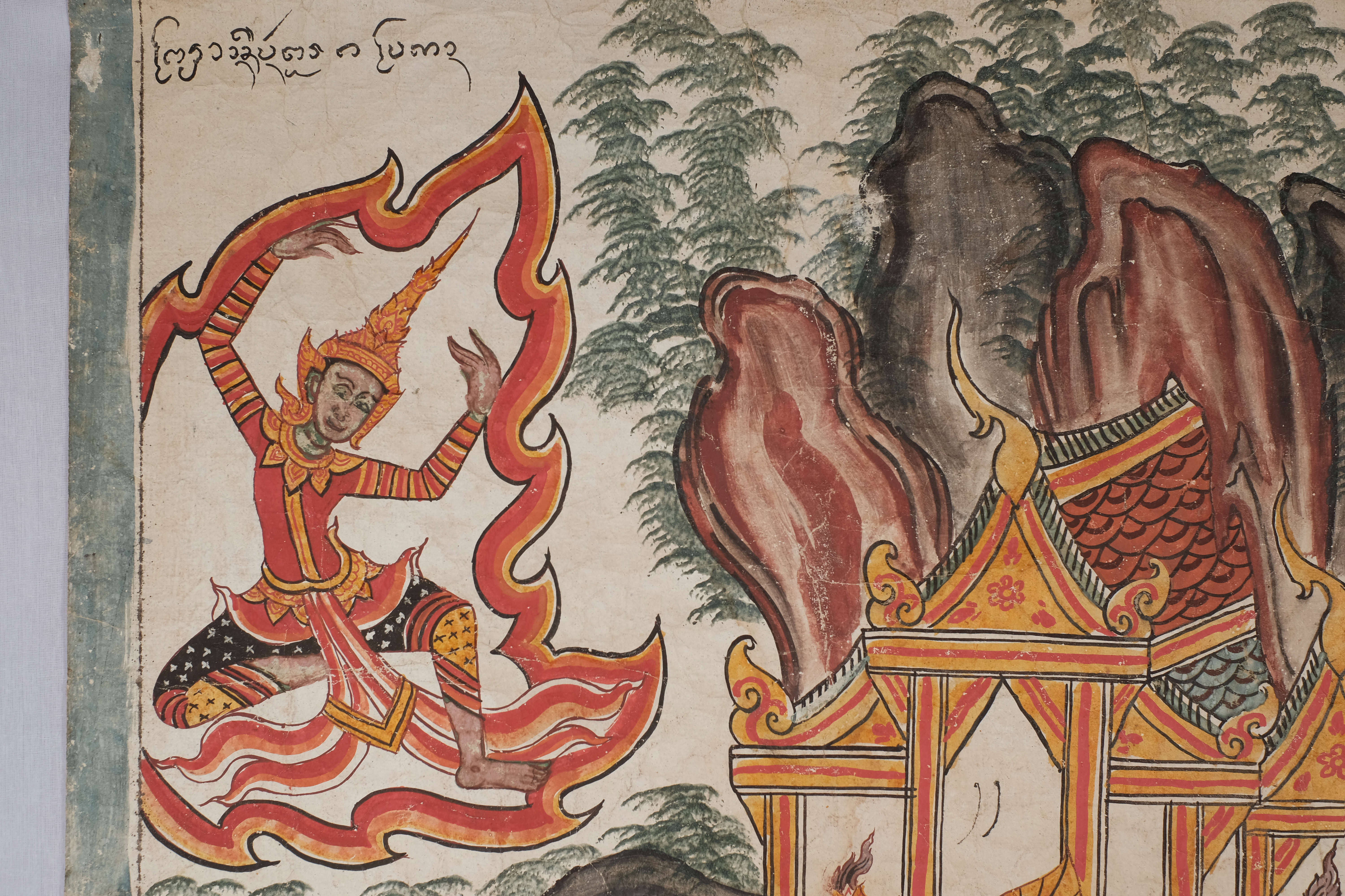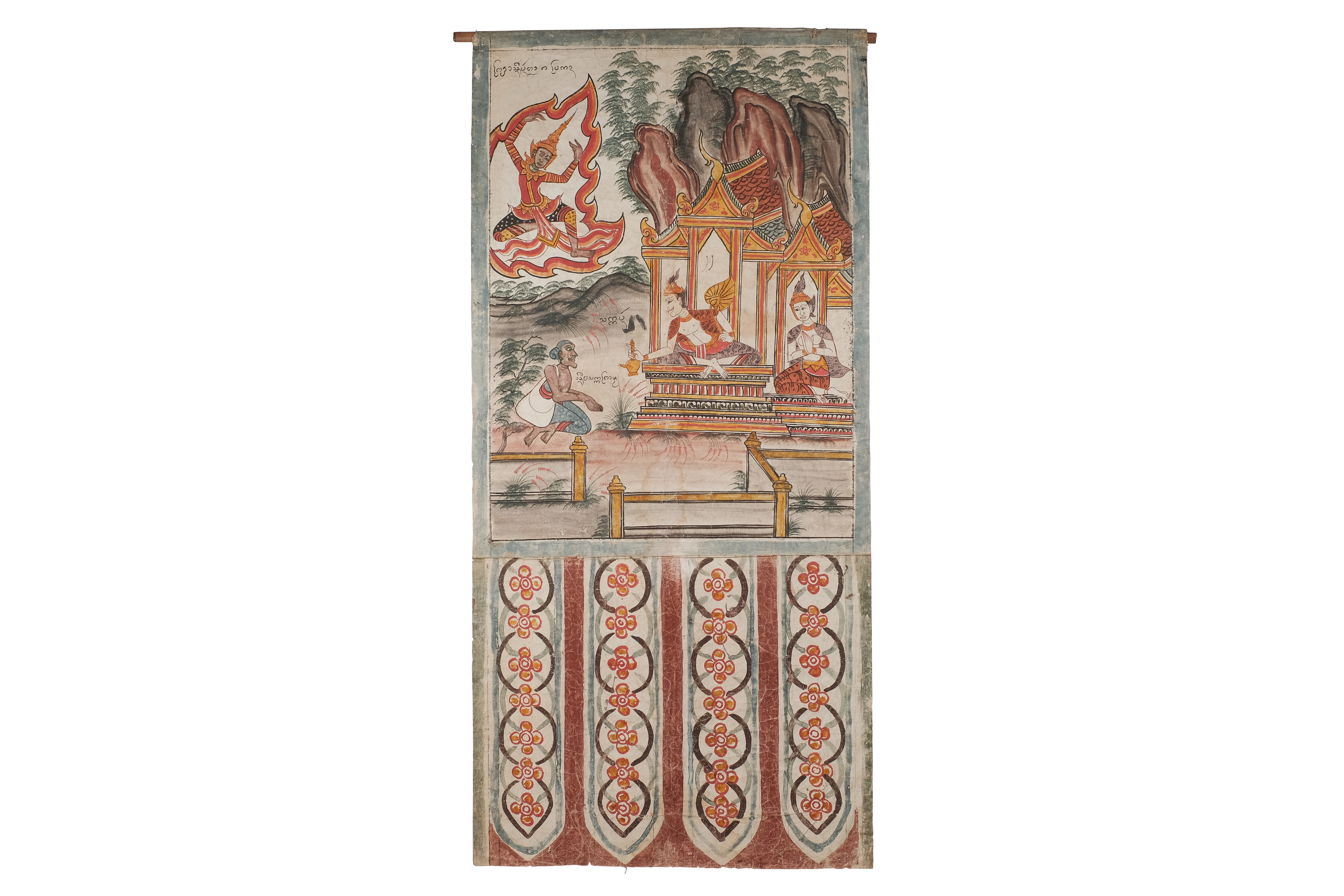 ลักษณะทางกายภาพ : ลักษณะเป็นกระดาษสี่เหลี่ยมผืนผ้า วาดด้วยสีฝุ่น ขนาดความกว้าง 65 เซนติเมตร ยาว 139 เซนติเมตร