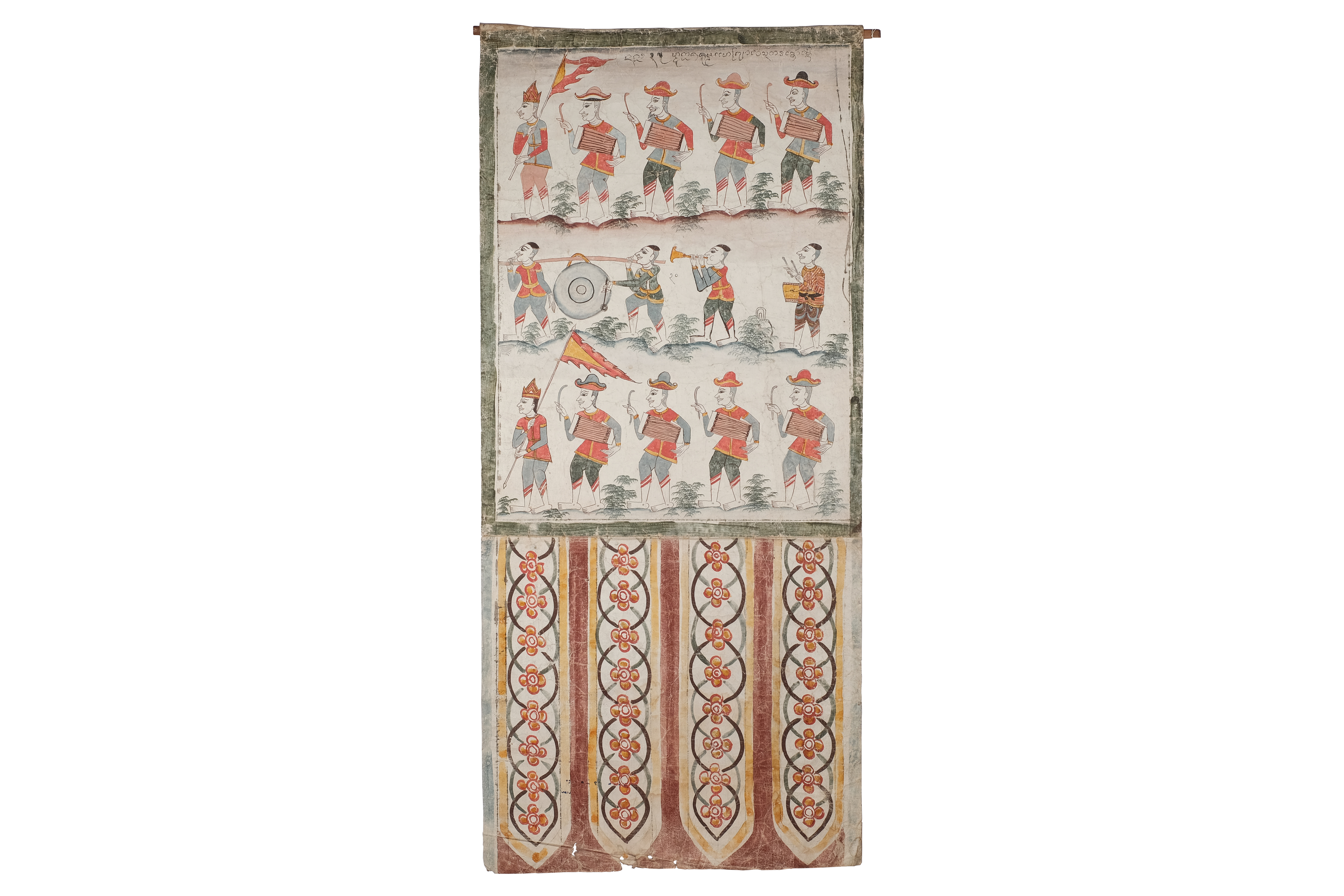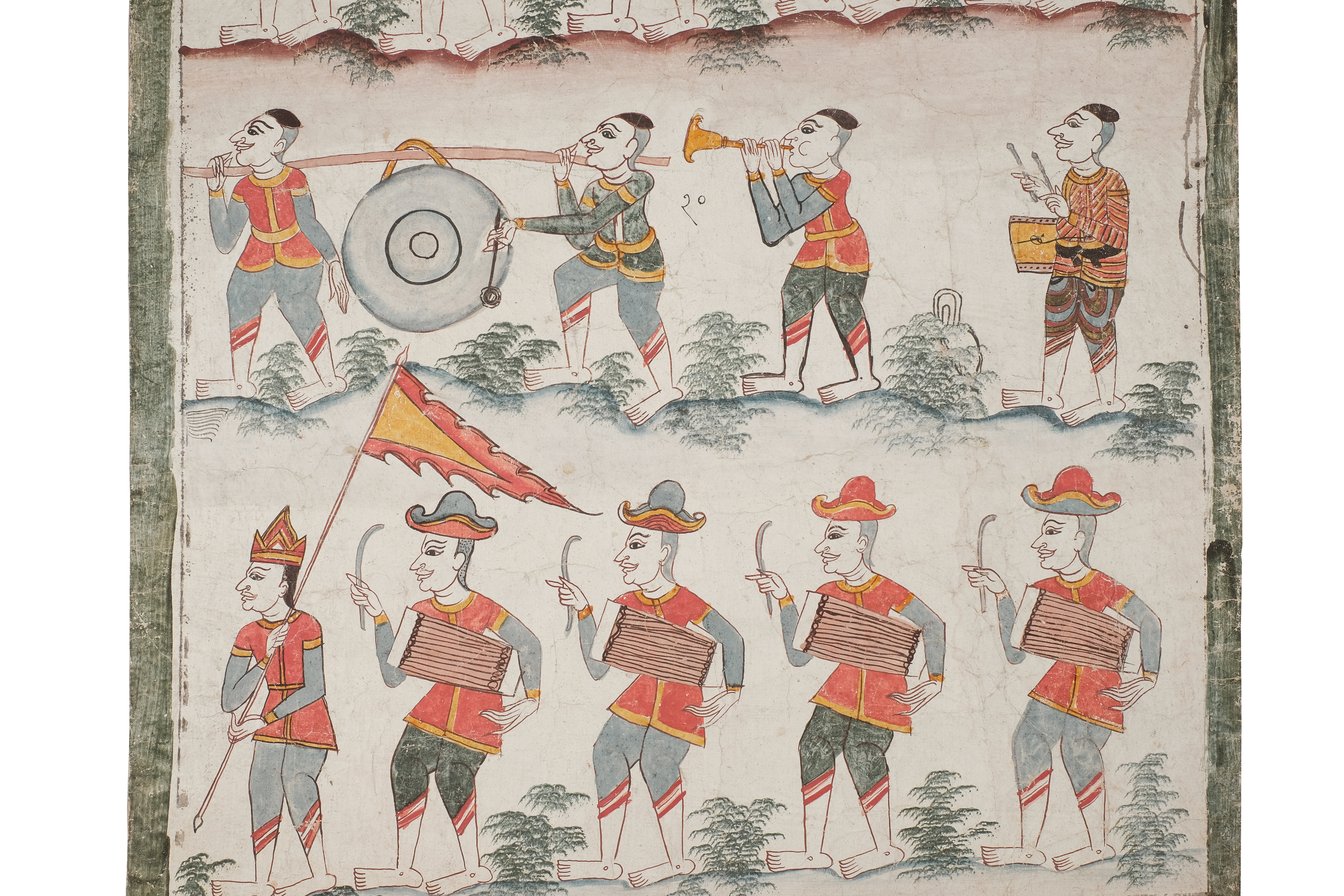 เป็นขบวนแห่นำเสด็จของพระเจ้าสัญชัย พระนางผุสดี พระชาลี พระกัณหา ที่กำลังเดินทางไปยังอาศรมของพระเวสสันดรและพระนางมัทรีในเขาวงกต เป็นภาพแถวขบวนทั้งหมด 3 แถว แถวบนเป็นขบวนกลองชนะ 4 ใบ คนตีกลอง มีการแต่งกายชุดทหารไทยใส่ใส่หมวกแบบฝรั่ง คนนำหน้าถือตุงช่อ (ธงไชย) แต่งการแบบทหารไทยใส่หมวกปลายแหลม 3 แฉก แถวกลางมีคนแบกฆ้องใหญ่ 2 คน เป่าปี่มอญ 1 คน ตีกลองตะโพน 1 ใบ รวมทั้งหมด 4 คน แต่งกายอย่างทหารไทยไว้ผมทรงมหาดไทย แถวล่างเหมือนกันกับแถวแรก ขบวนทั้งหมดนี้อยู่กลางพื้นที่ราบ ที่มีการกระทุ้งสีเป็นหย่อม ๆ ตามพื้นดิน เทคนิคสีที่ใช้คือสีฝุ่น สีที่ใช้มีทั้งหมด 8 สีคือ สีแดง เหลือง ดำ น้ำเงิน เปลือกไข่ น้ำตาลแดง ฟ้า เขียวเข้ม เชิงภาพพระบฏปรากฏลวดลายพรรณพฤกษา 4 ช่อง สีที่ใช้คือ เหลือง ฟ้า แดง น้ำตาลแดง น้ำตาลเข้ม ขนาดความกว้าง 66 เซนติเมตร ยาว 148 เซนติเมตร