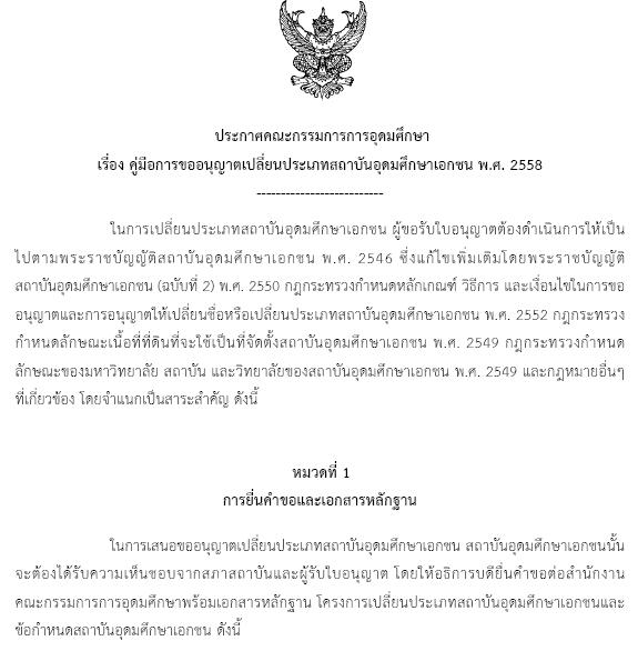 เรื่อง คู่มือการขออนุญาตเปลี่ยนประเภทสถาบันอุดมศึกษาเอกชน พ.ศ.2558