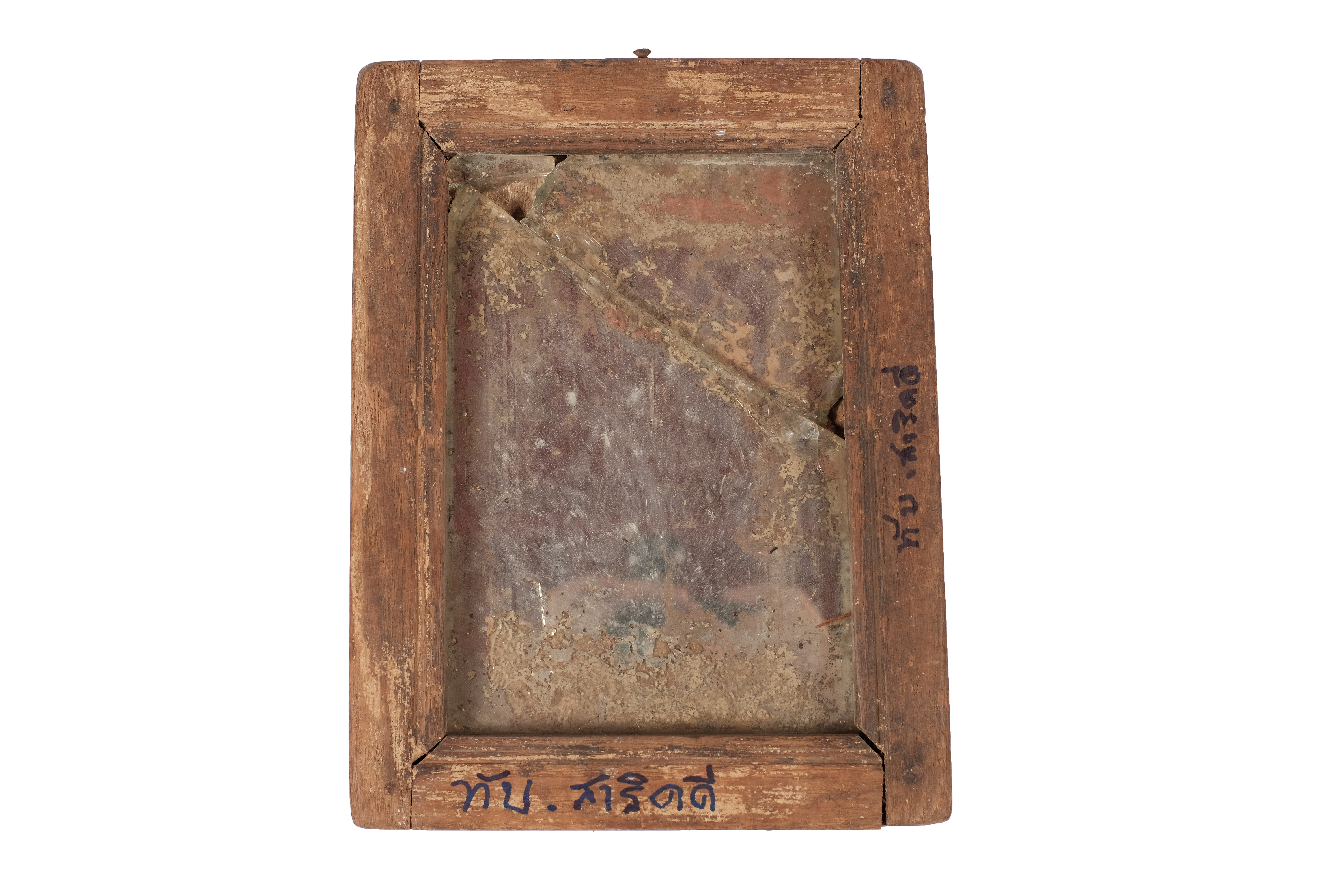 กระจกกรอบไม้สี่เหลี่ยมผืนผ้า ขนาดความกว้าง 25 เซนติเมตร ความยาว 8.8 เซนติเมตร มีสภาพชำรุด กระจกแตก ใช้สำหรับไว้ส่อง กระจกชิ้นนี้เดิมเป็นของ ทับ สาริดดี ซึ่งได้มอบให้พิพิธภัณฑ์