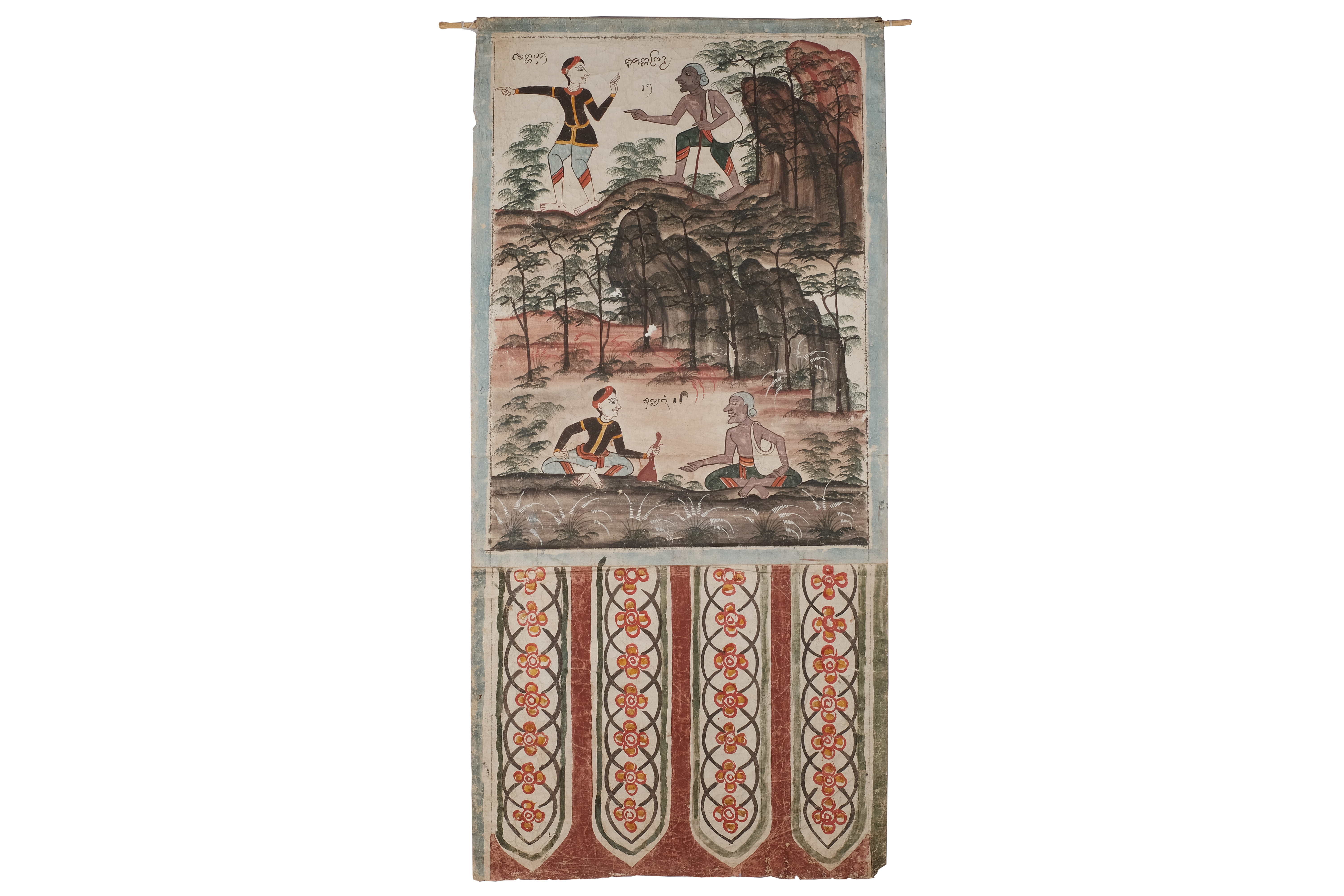 พรานเจตบุตรหลงเชื่ออุบายของเฒ่าชูชกว่าตนได้รับสาสน์จากพระเจ้าสัญชัยไปถวายพระเวสสันดร จึงบอกทางไปพบพระฤๅษีเพื่อจะได้ถามทางไปยังอาศรมพระเวสสันดร ภาพนี้มีความน่าสนใจคือองค์ประกอบของภาพที่เน้นเป็นภาพหุบเขาที่มีป่าไม้ปกคลุมอย่างหนาแน่น ตัวหุบเขาก็มีความหมายคล้ายคลึงกับเส้นสินเทาที่เป็นตัวแบ่งเรื่องราวเป็นตอนๆ ช่างได้ใช้เทคนิคการกระทุ้งสีเป็นรูปต้นไม้ รูปพุ่มไม้ที่มีดอกไม้ป่าสีขาวและสีแดงเต็มรูปภาพล่าง อีกทั้งการให้สีของหุบเขามีการให้น้ำหนักหนักเบาอย่างสวยงามซึ่งดูแล้วมีมิติ เทคนิคสีที่ใช้คือสีฝุ่น สีที่ใช้มี 9 สีคือ สีแดง เหลือง ขาว ดำ ฟ้า เขียวแก่ น้ำตาลแดง น้ำตาลเข้ม เทาปนแดง เชิงภาพพระบฏปรากฏลวดลายพรรณพฤกษา 4 ช่อง สีที่ใช้คือสีเหลือง แดง ดำ เขียวแก่ น้ำตาลแดง ขนาดความกว้าง 67 เซนติเมตร ยาว 139 เซนติเมตร