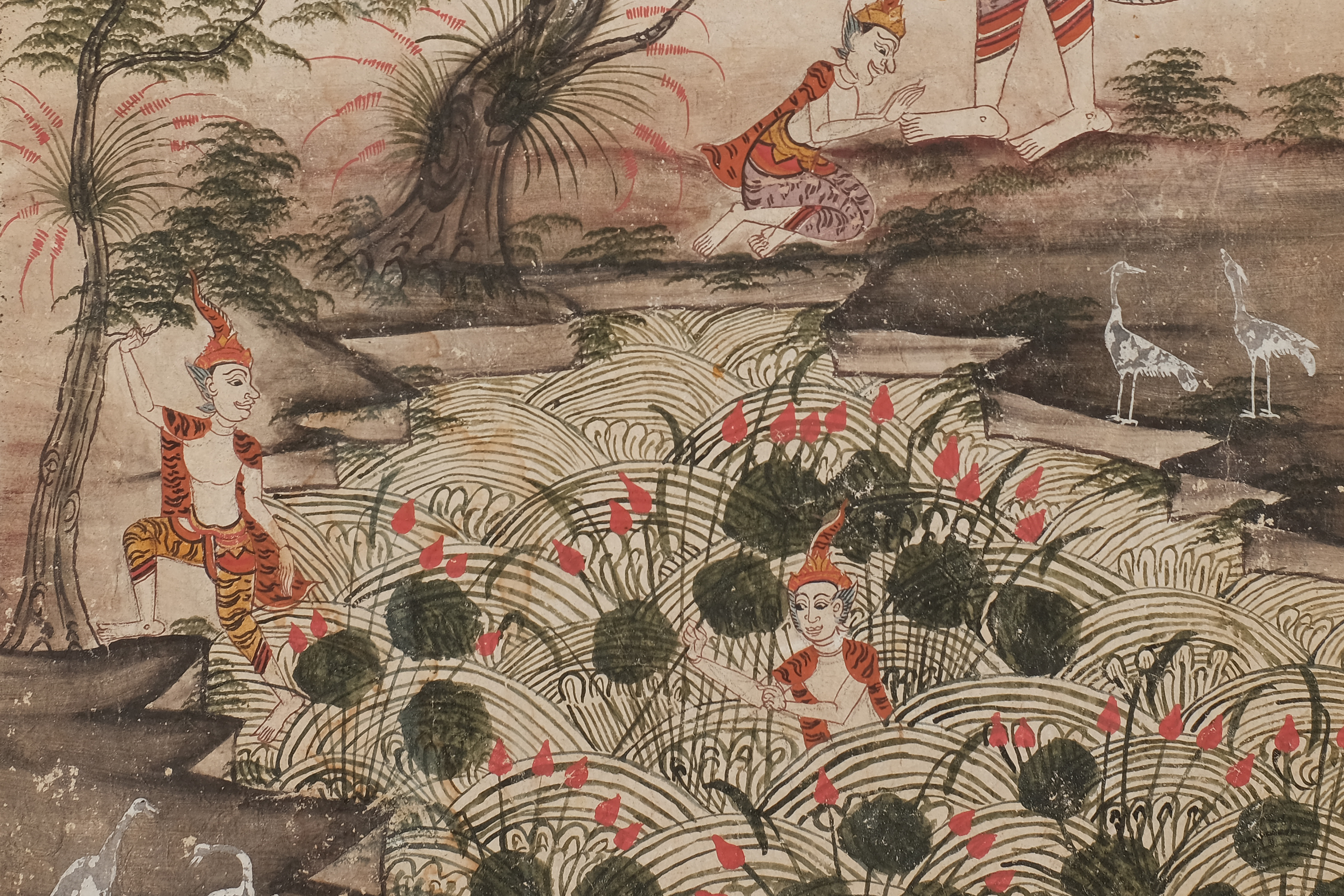 สองพระกุมารทราบว่าพระเวสสันดรจะทานตนให้เฒ่าชูชกจึงหนีไปซ่อนตัวที่สระบัว