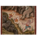 เฒ่าชูชกเอาเชือกมัดสองพระกุมาร ระหว่างทางกลับนครโกสิมพีก็มีการเฆี่ยนตีสองกระกุมารไปด้วย ทำให้ผู้ชมเกิดอารมณ์รู้สึกสงสารสองพระกุมารเป็นอย่างยิ่ง ภาพนี้จะเน้นการวาดภาพหุบเขาสูงอยู่สองฟาก ซึ่งช่างมีการใช้สีที่หลากหลายในการวาดหุบเขาให้ดูมีมิติความลึกลื้น เขาบางลูกก็มีการนำสีขาวมาตัดเส้นเพื่อความชัดเจนและความโดดเด่นของหุบเขาซึ่งนับว่าช่างเขียนภาพมีความเข้าใจและมีลูกเล่นในการเขียนภาพพอสมควรนอกจากนี้ยังปรากฏการใช้เทคนิคกระทุ้งสีเป็นรูปต้นไม้และพุ่มไม้ปกคลุมอยู่อย่างหนาแน่น มีฝูงกวาง 4 ตัวกำลังหยอกล้อกันอยู่ด้านล่างของภาพ เทคนิคสีที่ใช้คือสีฝุ่น สีที่ใช้มีทั้งหมด 13 สีคือ สีแดง เหลือง ส้ม ขาว เทาปนแดง ฟ้า ม่วง ดำ น้ำตาลแดง น้ำตาลเข้ม เขียวแก่ เขียวอ่อน เทา เชิงภาพพระบฏปรากฏลวดลายพรรณพฤกษา 4 ช่อง สีที่ใช้คือ น้ำตาลเข้ม น้ำตาลแดง เหลือง เขียวแก่ แดง ขนาดความกว้าง 66.5 เซนติเมตร ยาว 140 เซนติเมตร