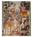 เทวดาแปลงกายเป็นพญาสัตว์ป่าขวางทางมิให้นางมัทรีไปพบสองพระกุมาร