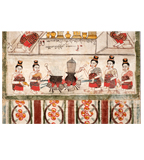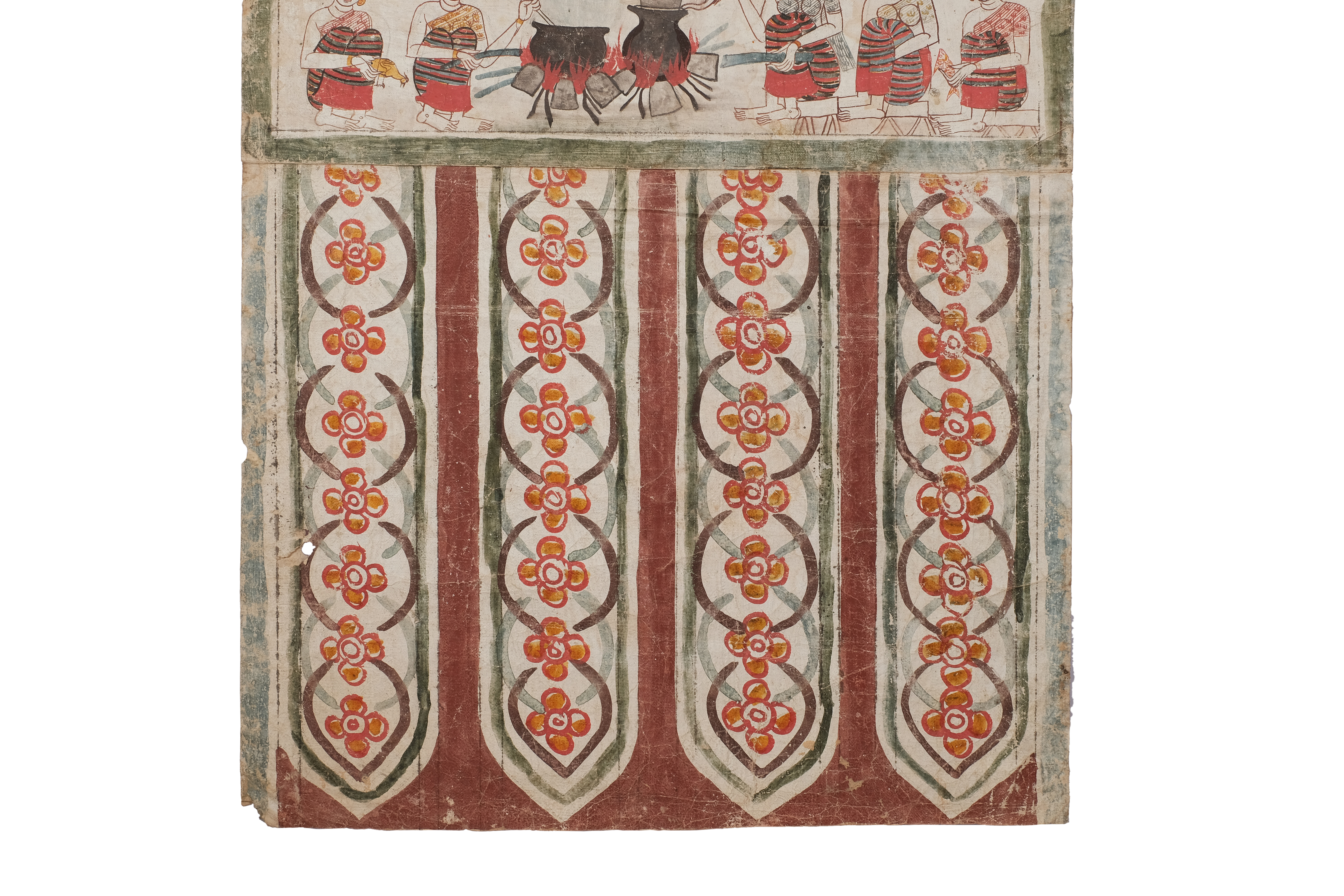 หลังจากที่พราหมณ์เฒ่าชูชกได้รับรางวัลจากการนำสองพระกุมารมาไถ่ตัว และพระเจ้าสัญชัยก็จัดให้มีงานเลี้ยงรื่นเริง เฉลิมฉลองแก่พราหมณ์เฒ่าชูชก ด้วยการให้นางกำนัลมาปรนนิบัติเป็นอย่างดีทั้งสุรา อาหาร เหล่านางในมีการแต่งกายแบบพื้นเมืองคือ มวยผมสูงปักปิ่นจ้องและรัดเกล้า ใส่ลานหู ห่มสไบลายดอกแบบโปร่งสีแดง 12 คน เหลือง 1 คน ฟ้า 2 คน นุ่งซิ่นต๋าต่อตีนแดง มีทั้งหมด 17 คน นางกำนัลกลุ่มบนก็ต่างพากันเอาใจปรนนิบัติชูชกอย่างดี ส่วนนางกำนัลกลุ่มล่างมีการหุงต้มอาหารซึ่งสามารถศึกษาถึงเครื่องมือในการประกอบอาหารในสมัยอดีตได้เป็นอย่างดีเช่น หม้อตาล ซึ้งข้าว ป๊าก(ทัพพี) มีไก่และปลาเป็นเครื่องประกอบอาหารหลักๆ และช่างก็มีอารมณ์สนุกสนานในการเขียนภาพเช่น ชูชกจับหน้าอกของนางกำนัล และเครื่องราชูปโภคทองคำเช่น ขันซี่ น้ำต้น กระโถน จอกเหล้า ซึ่งสามารถบอกได้ว่าตัวช่างก็มีความรู้เกี่ยวกับข้าวของเครื่องใช้พอสมควร ซึ่งองค์ประกอบทั้งหมดนี้อยู่ในตัวอาคารทรงปราสาทหลังคาซ้อนชั้นกัน 5 ชั้นและมีปราสาทยอดอยู่ตรงกลา เทคนิคสีที่ใช้คือสีฝุ่น มีทั้งหมด 7 สีคือ สีแดง เหลือง ดำ ฟ้า น้ำเงิน เทาอมแดง เทา เชิงภาพพระบฏปรากฏลวดลายพรรณพฤกษา 4 ช่อง สีที่ใช้คือสีฟ้า น้ำตาลเข้ม น้ำตาลแดง เหลือง แดง เขียวเข้ม ฟ้า ขนาดความกว้าง 67.5 เซนติเมตร ยาว 142 เซนติเมตร
