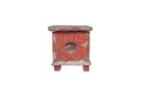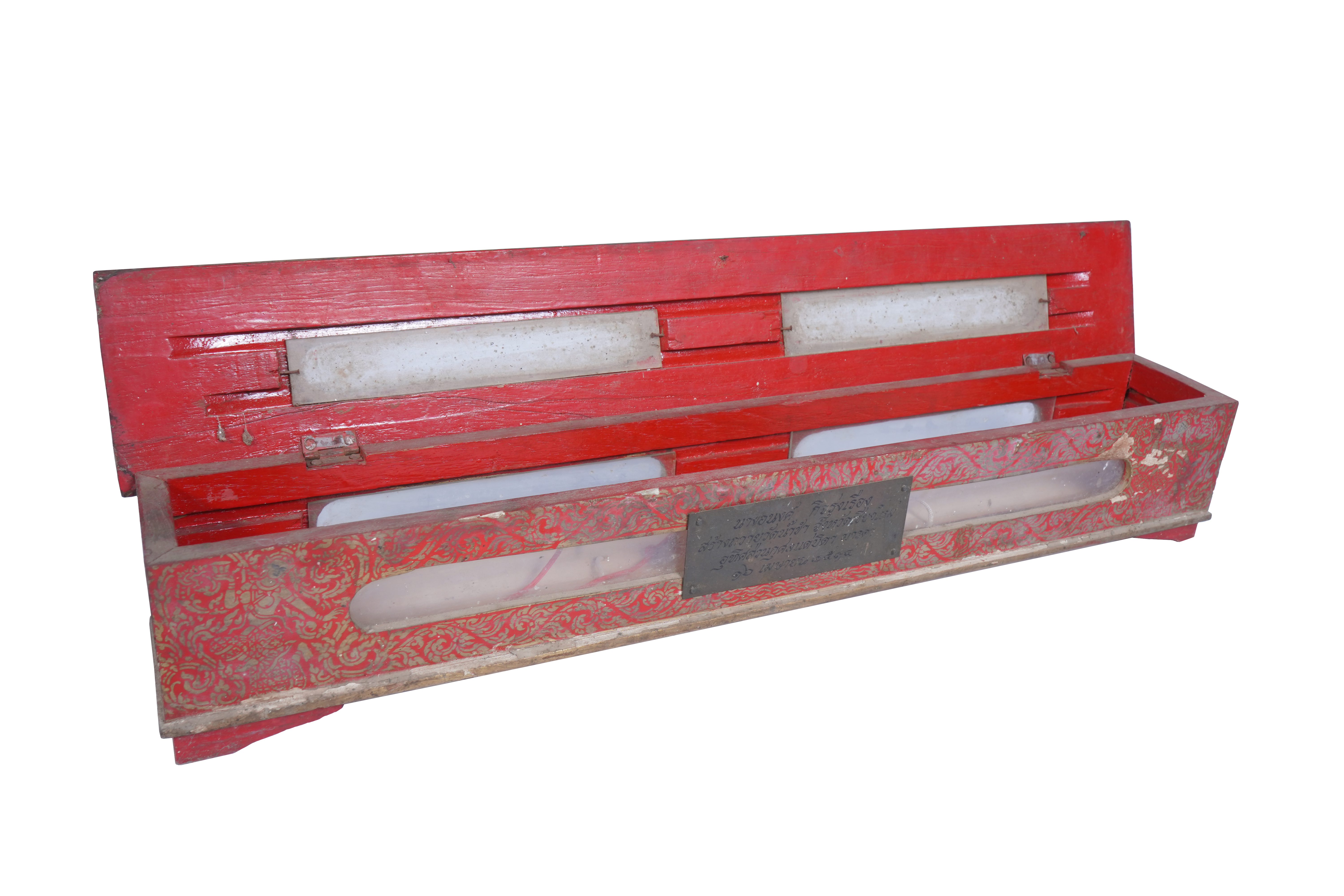 ลักษณะทางกายภาพ : กล่องไม้มีฝาปิดทรงสี่เหลี่ยมผืนผ้า สีแดงพร้อมประดับลวดลายล้านนา