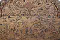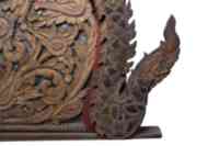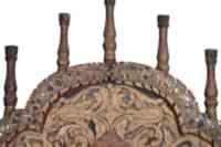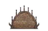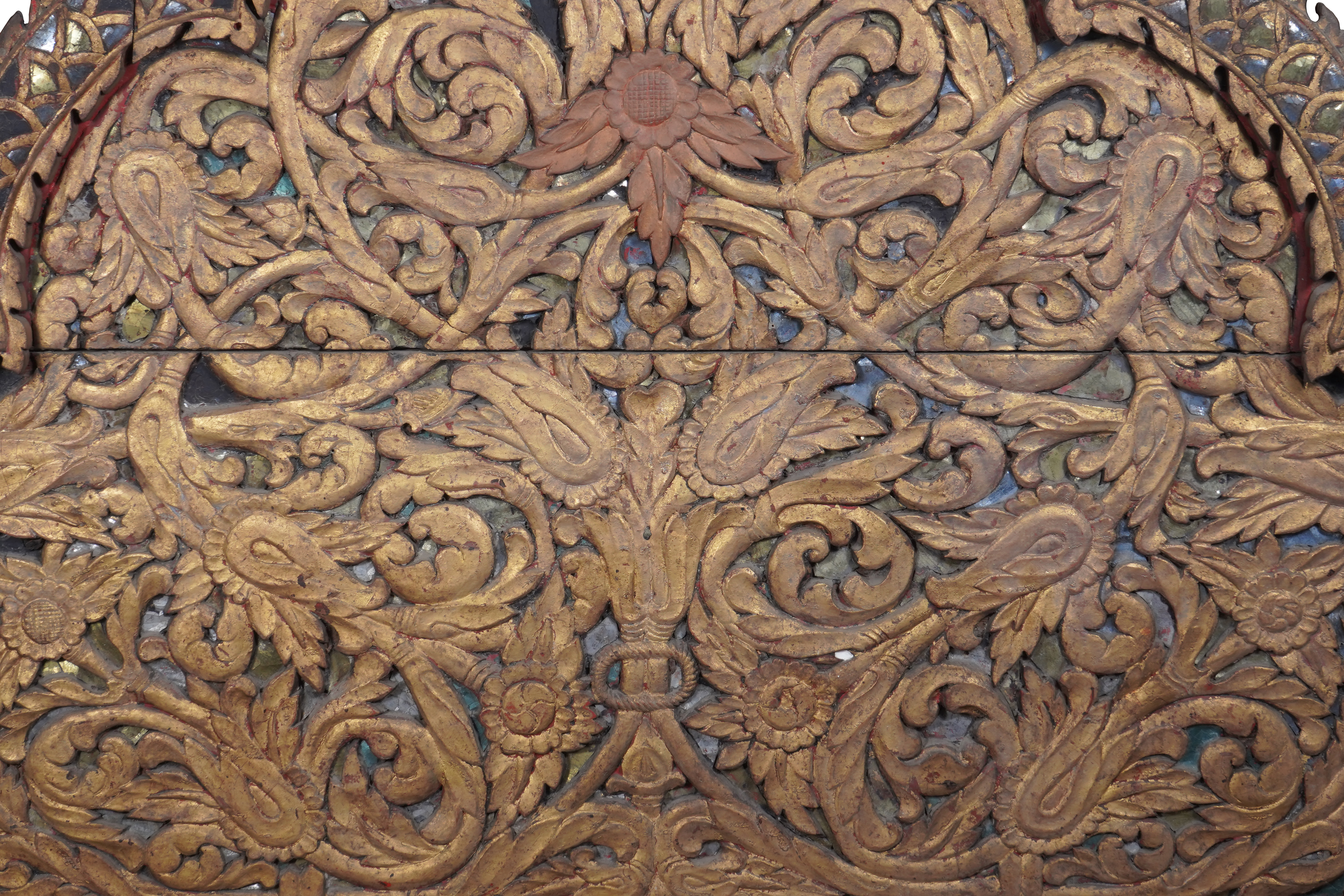 คำอธิบายวัตถุ : สัตภัณฑ์ ขนาดความกว้าง 152 เซนติเมตร สูง 143 เซนติเมตร ใช้สำหรับเป็นเชิงเทียนตั้งไว้หน้าพระปรานในวิหารของล้านนา เป็นเครื่องประกอบพิธีทางศาสนา นิยมสร้างเป็นรูปสามเหลี่ยม หรือโค้งคล้ายหัวเตียง บนยอดมีที่สำหรับปักเทียน 7 เล่ม มีคำสันนิษฐานว่า 7 น่าจะหมายถึงภูเขา 7 ลูกที่รายล้อมาเข้าพระสุเมรุ หรือองค์พระธาตุเจดีย์